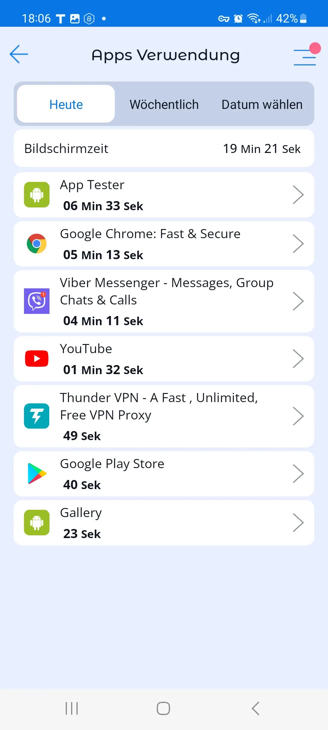 - Anzeige der Gesamtzeit der App-Nutzung in den letzten 24 Stunden oder an einem ausgewählten Datum;
