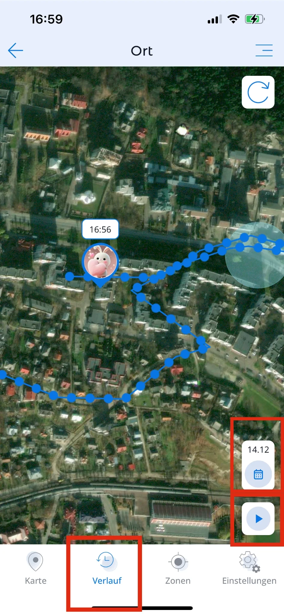 Um die Routen zu sehen, auf denen sich das Kind bewegt hat, gehen Sie zum Abschnitt „Standort“, Tab „Bewegungsverlauf“. Wählen Sie dann den Wochentag aus, für den Sie die Daten ansehen möchten: heute, gestern oder wählen Sie einen Tag im Kalender aus. Sie haben die Möglichkeit, die Bewegungsverlauf der letzten 7 Tage einzusehen.