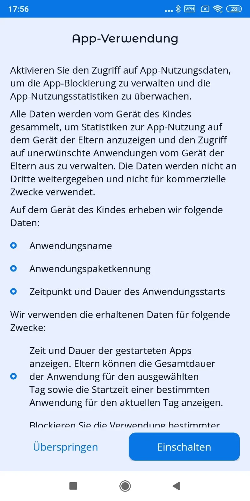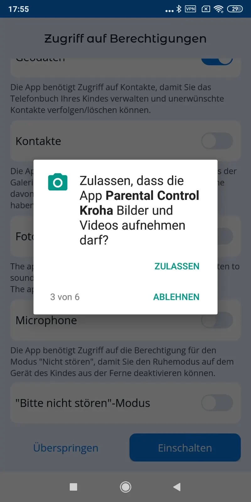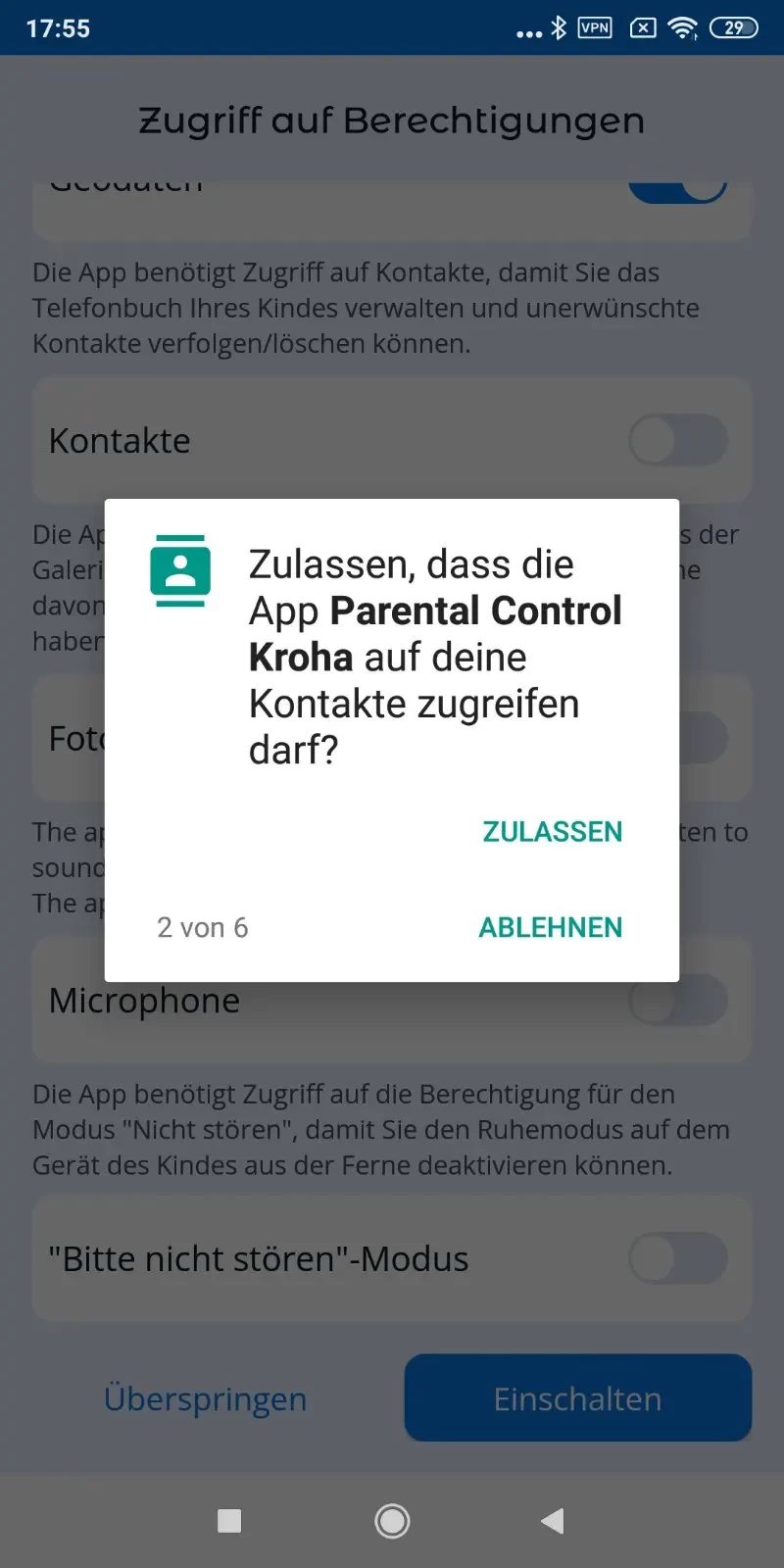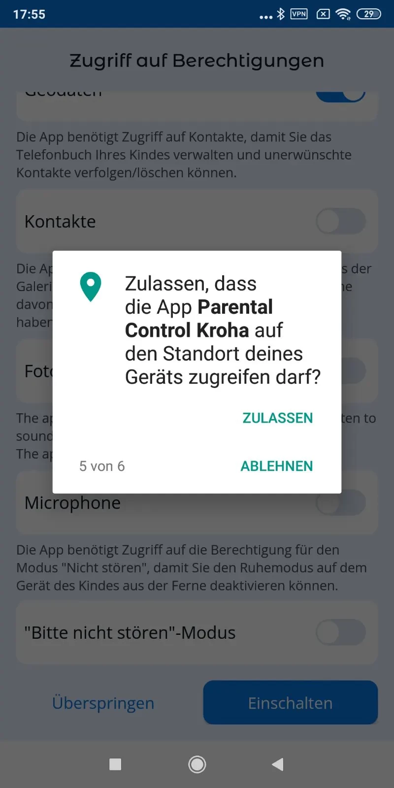 Für eine ordnungsgemäße Funktionsweise der App müssen die Berechtigungen beim Verbinden des Geräts des Kindes mit Ihrem Konto eingestellt werden.