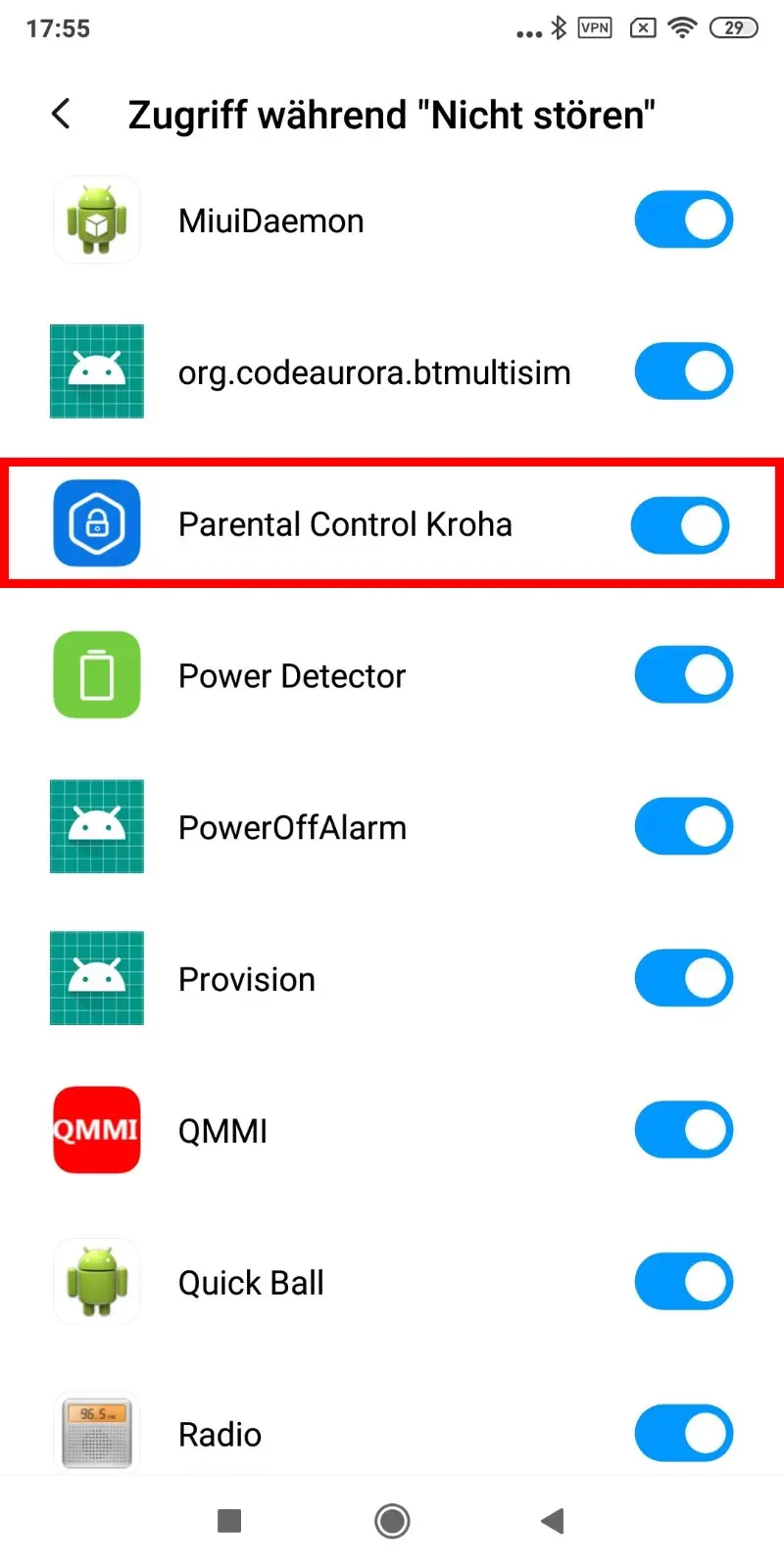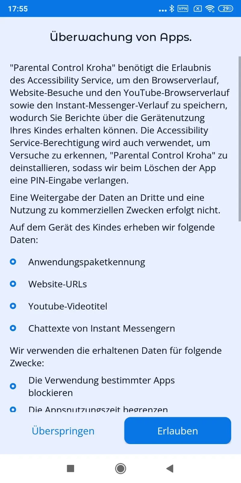 „Schutz vor Deinstallation“, aktivieren Sie den Administrator-Modus für die Parental Control Kroha-App. Dies verhindert, dass das Kind die App ohne PIN-Code vom Gerät entfernt. Befolgen Sie dazu die Schritt-für-Schritt-Anleitung und klicken Sie auf „Zulassen“;