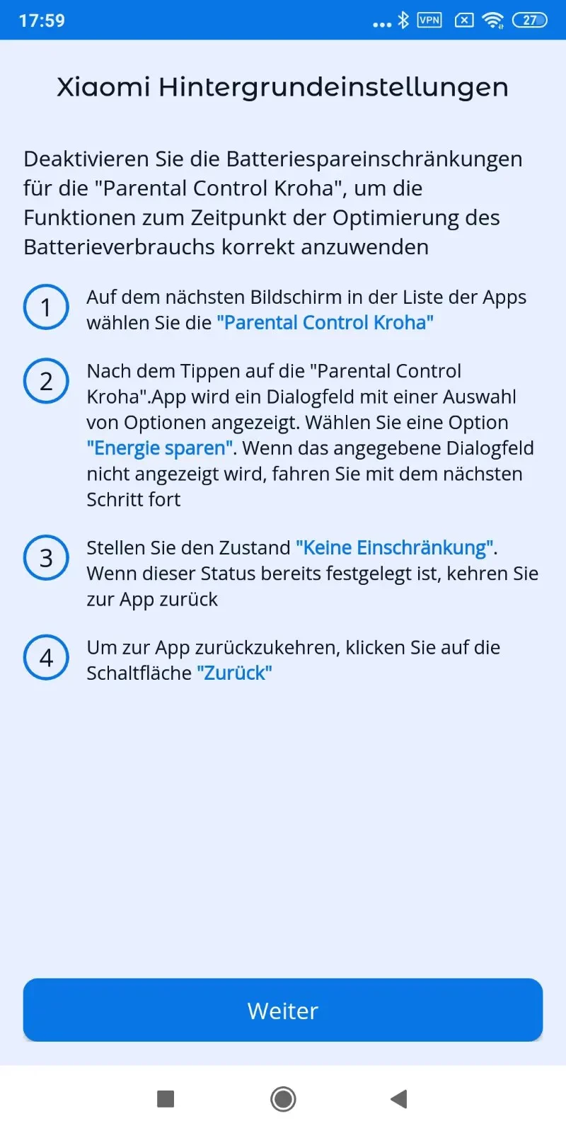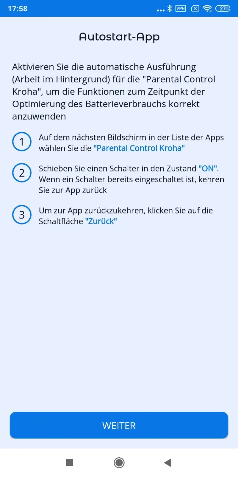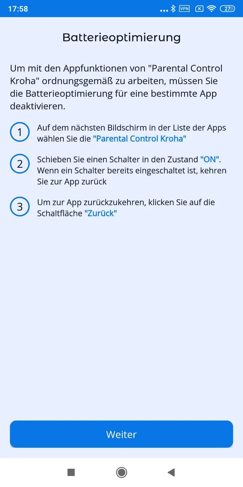 „Batterieoptimierung“, für die ordnungsgemäße Funktion der App müssen Sie die Batterieoptimierung für die Parental Control Kroha-App deaktivieren. Befolgen Sie dazu die Schritt-für-Schritt-Anleitung und klicken Sie auf „Weiter“;