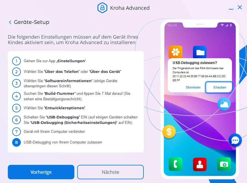 Auf dem Gerät des Kindes erscheint nicht die Benachrichtigung „USB-Debugging erlauben“ und die Schaltfläche „Weiter“ ist nicht aktiv.