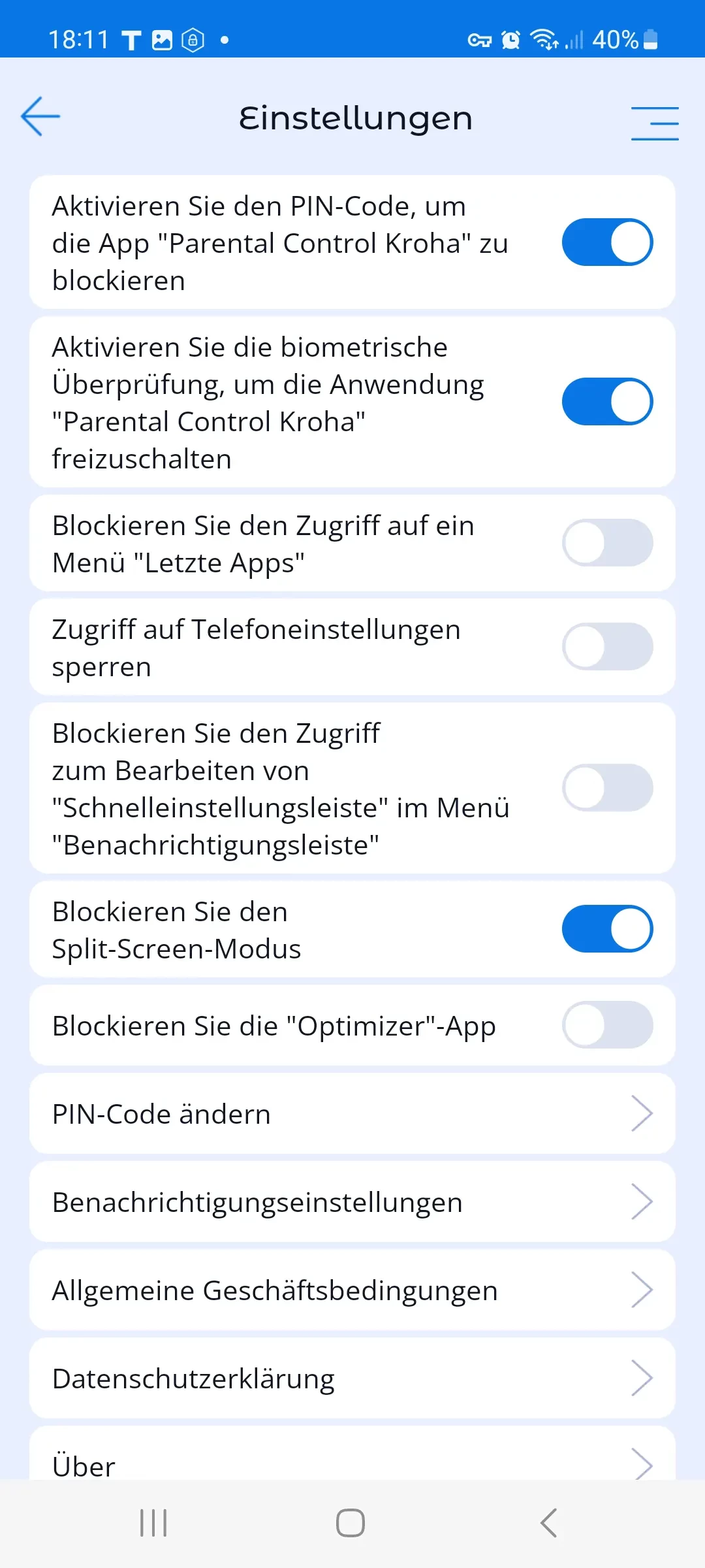 7. Einstellungen In diesem Menü finden Sie Funktionen, die den Eltern helfen, bestimmte Optionen auf dem Smartphone des Kindes zu sperren, die die Funktionalität der App einschränken.