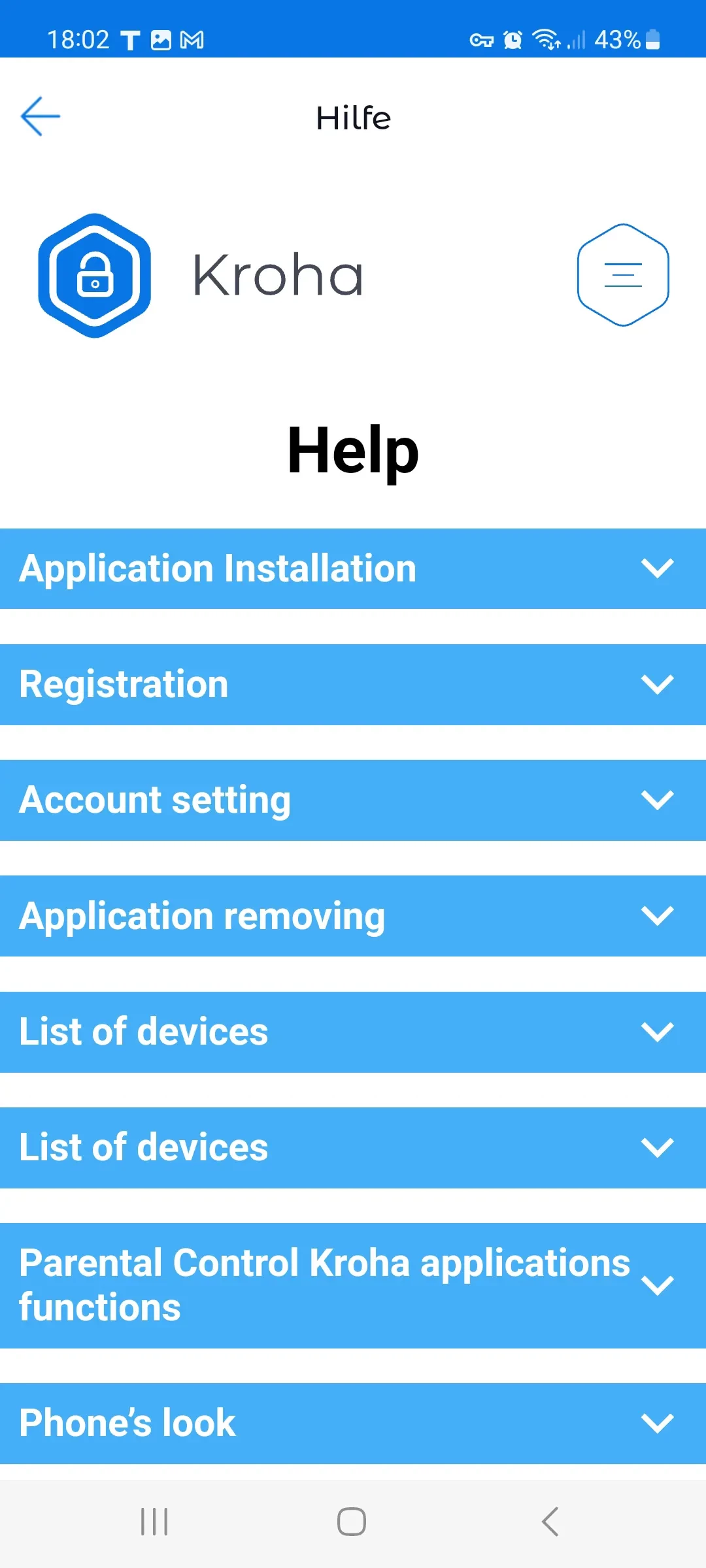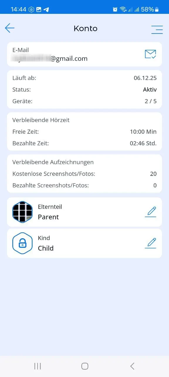 1. Geräte Wenn dieser Menüpunkt ausgewählt wird, gelangt der Benutzer auf den Hauptbildschirm der App mit einer Liste der überwachten Kindgeräte.