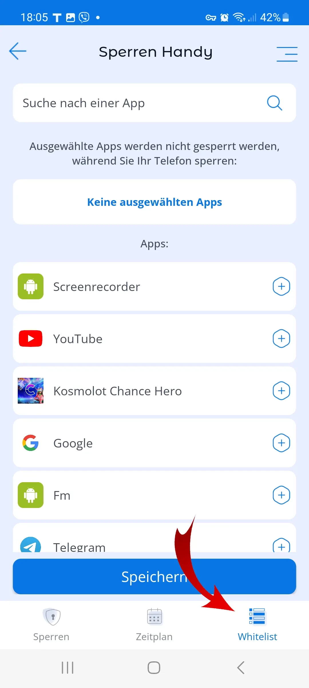 Dies ist ein spezieller Abschnitt, in dem der Benutzer Apps hinzufügen kann, die nicht blockiert werden sollen, wenn das Telefon gesperrt ist. Beispielsweise haben die Eltern dem Kind erlaubt, ein Spiel zu spielen, daher muss es in die weiße Liste aufgenommen werden.