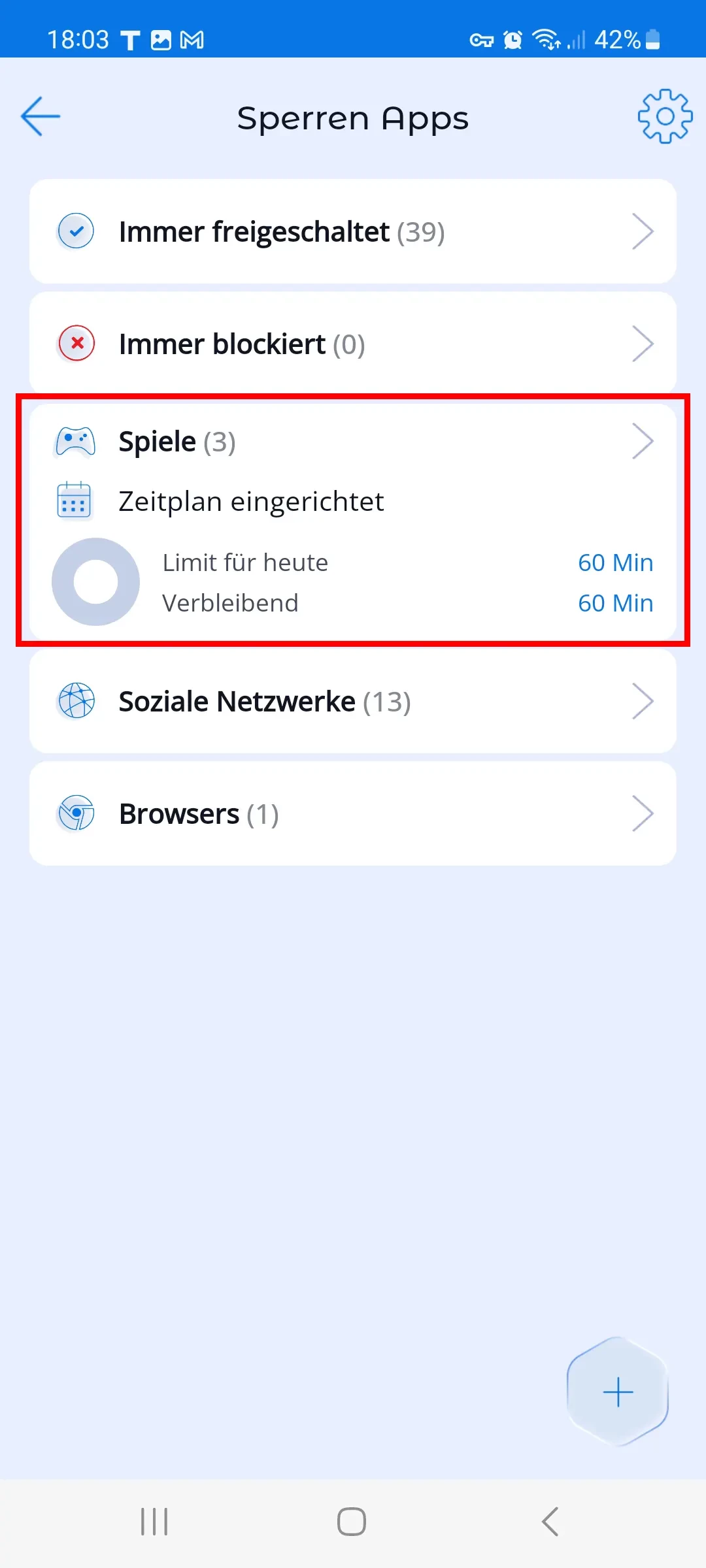 In der Liste der Kategorien können Eltern die Gesamtzahl der Apps sehen. Sowohl Eltern als auch Kinder können die festgelegten Einschränkungen und die verbleibende Nutzungszeit in den Kategorien mit Einschränkungen einsehen.