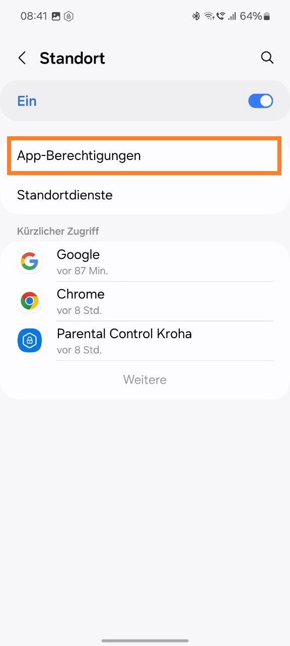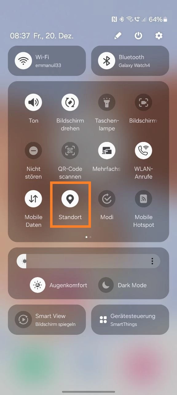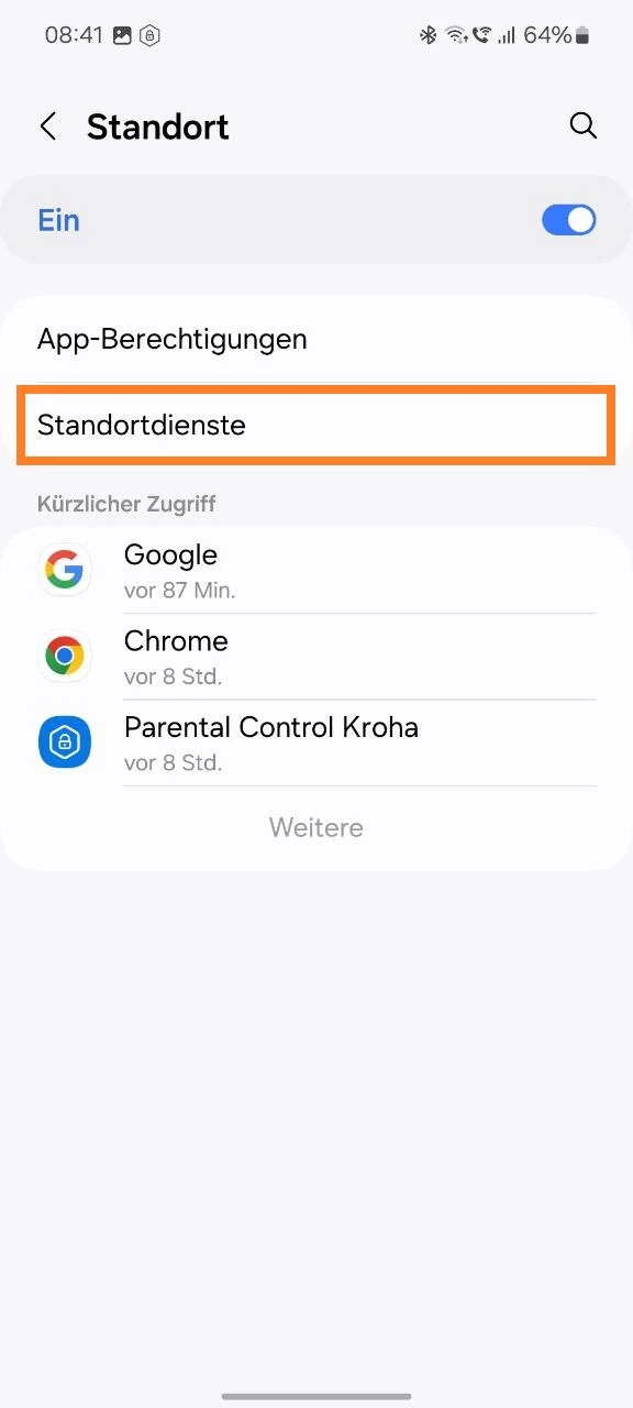 Für den Erhalt von Geolokalisierungsdaten muss auf dem Gerät des Kindes der "Zugriff auf Geodaten" aktiviert sein. Dazu aktivieren Sie auf dem Gerät des Kindes in der "Benachrichtigungsleiste" die Option "Zugriff auf Geodaten".