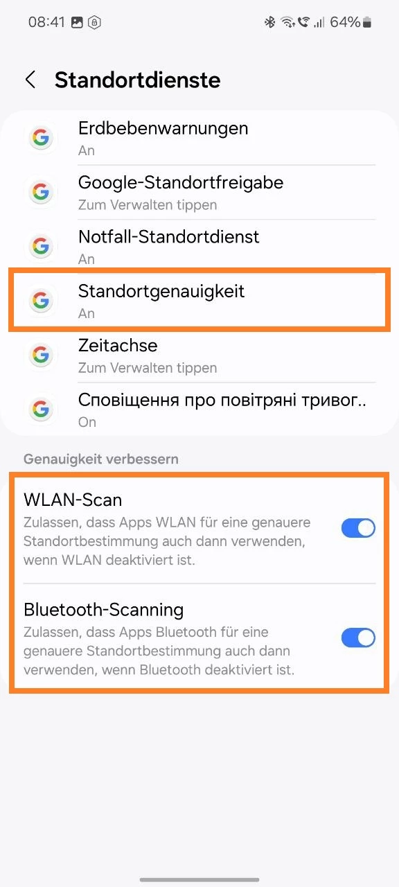 Um die Geodaten zu erhalten und die Genauigkeit des Standorts zu verbessern, überprüfen Sie bitte die folgenden Einstellungen: