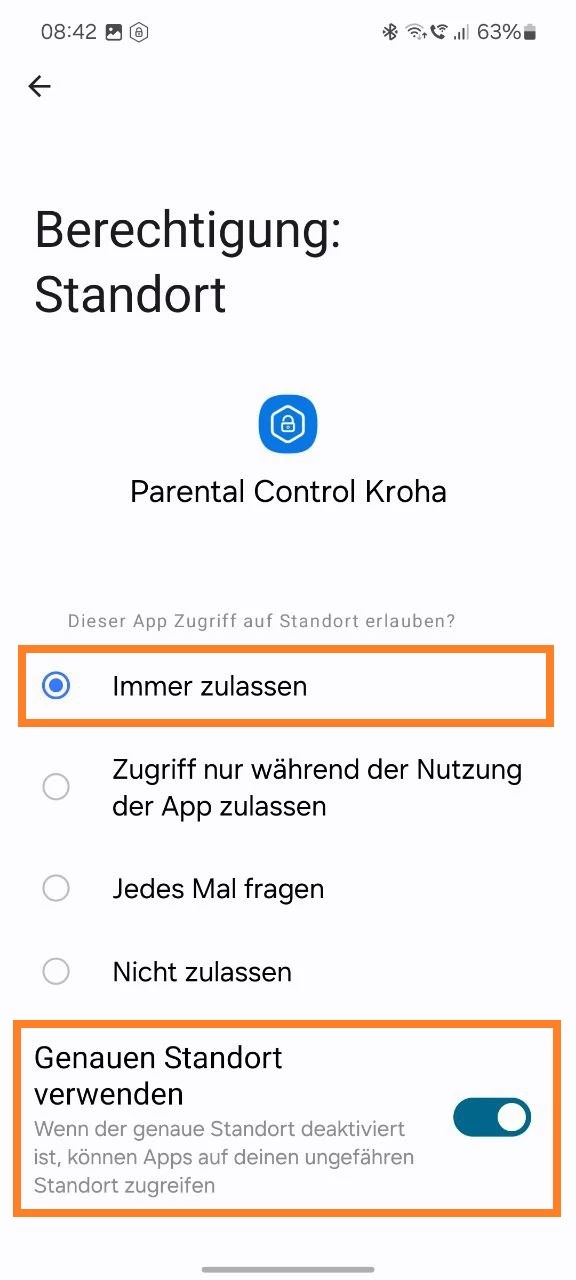 4. Öffnen Sie die Einstellungen auf dem Gerät des Kindes, suchen Sie den Punkt „Standort“, gehen Sie weiter zu „Berechtigungen für Apps“, wählen Sie die App „Parental Control Kroha“ und aktivieren Sie „Zulassen im beliebigen Modus“ oder „Über alle Quellen“ – die App hat dann immer Zugriff auf den Standort des Geräts.