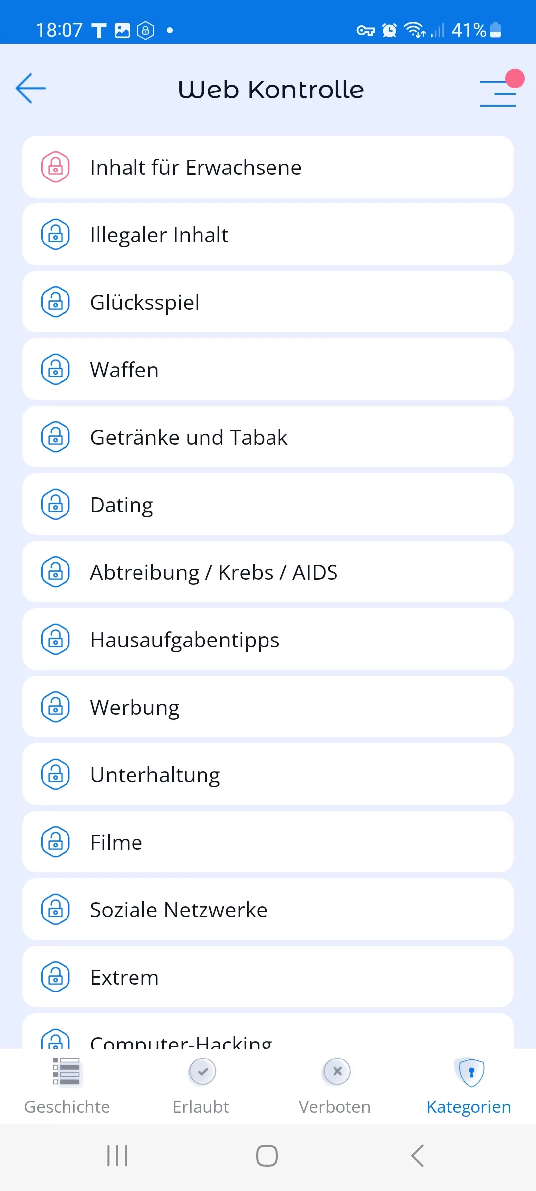 - Blockierung unerwünschter Kategorien von Webseiten, wie zum Beispiel „Inhalte für Erwachsene“;