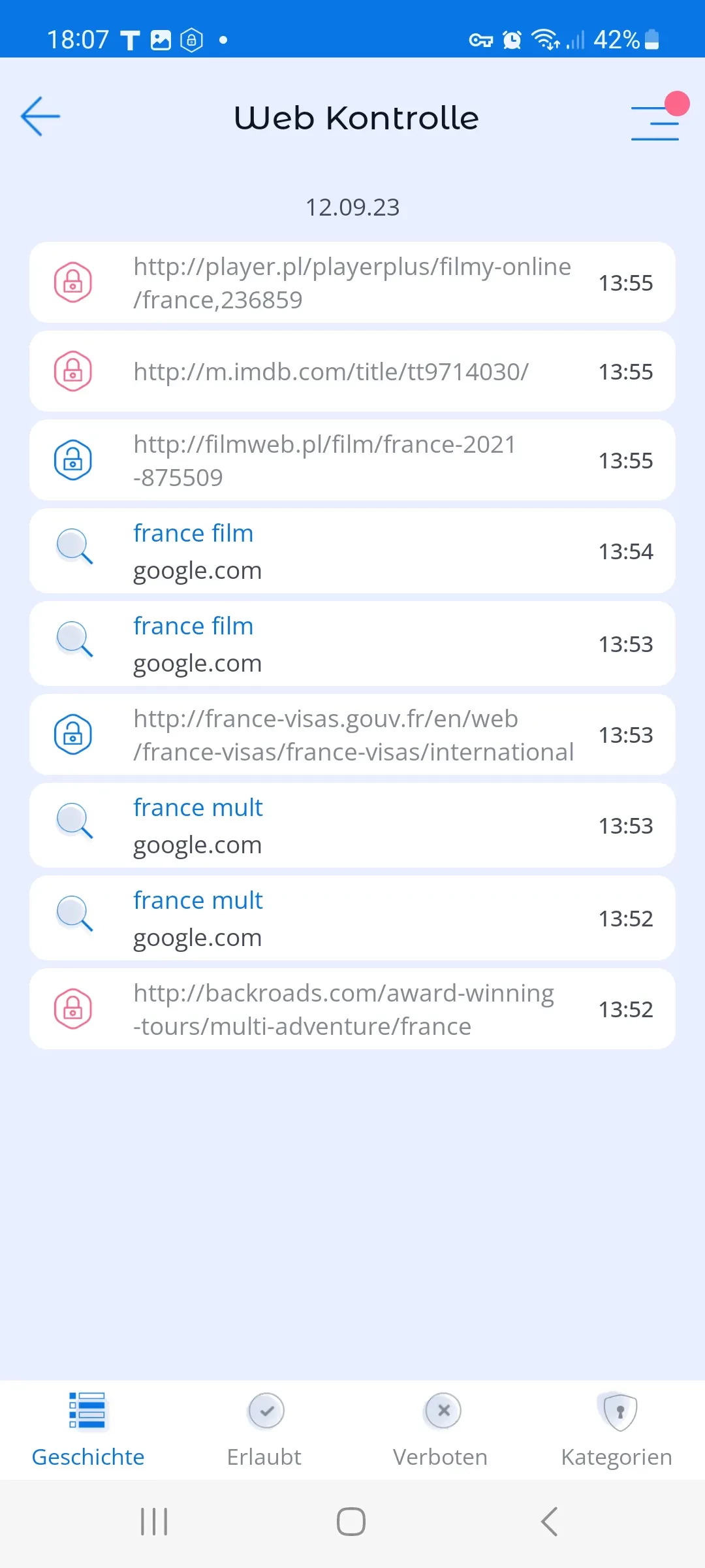 - Die Ansicht der Verlaufshistorie der Webseiten, die das Kind besucht hat;