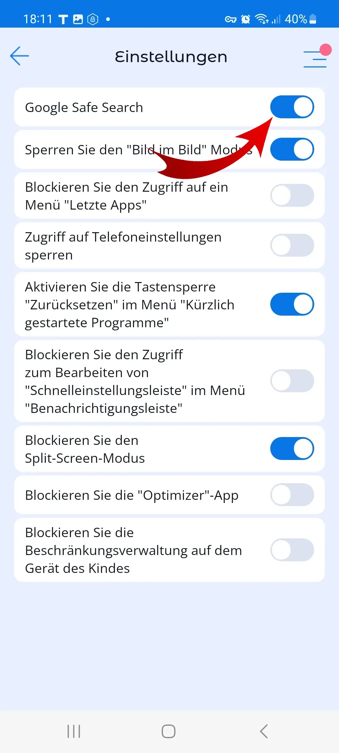 - Sicheres Suchen in der GOOGLE-Suchmaschine. Diese Funktion ermöglicht es, unerwünschte Inhalte bereits während der Google-Suche oder im Google Chrome-Browser herauszufiltern;