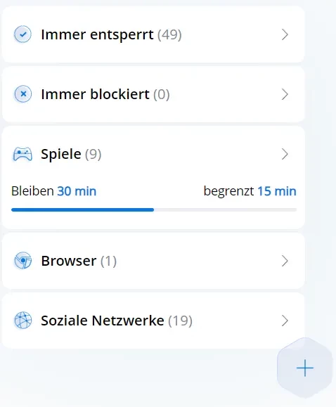 Die Funktion „App-Blockierung“ ermöglicht es den Eltern, die auf dem Smartphone des Kindes installierten Apps (Spiele, soziale Netzwerke, andere Programme) zu überwachen. Mit dieser Funktion können Eltern: