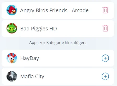 2. Neue installierte Apps in die für die Eltern passende Kategorie verschieben, die bereits mit Einschränkungen versehen ist.