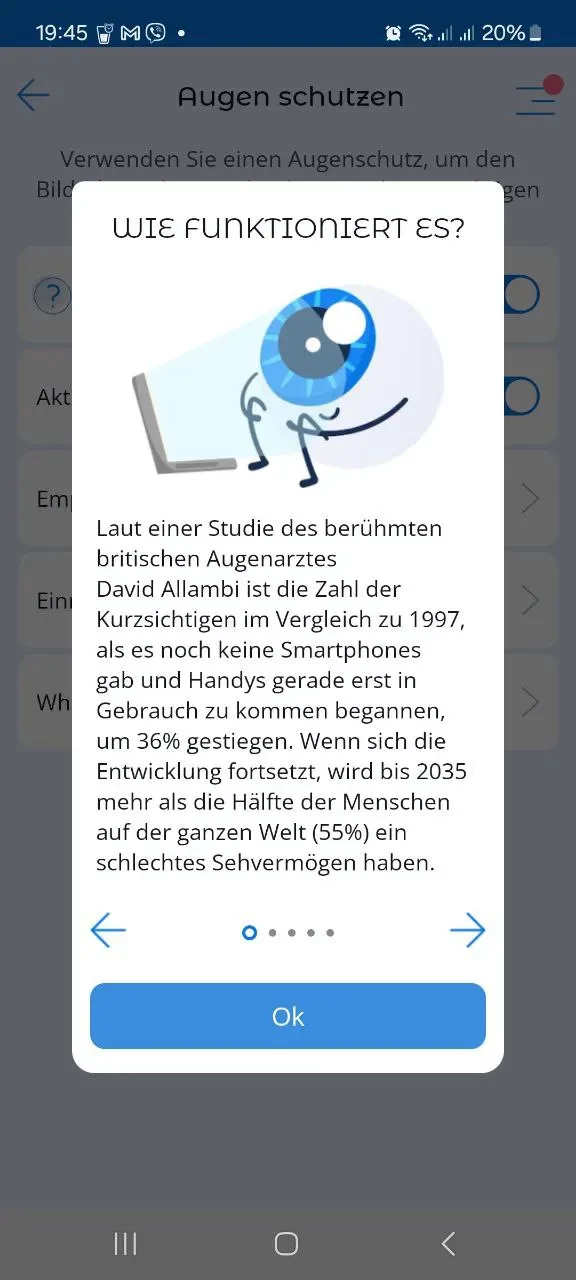 Um sich detaillierter mit dem Thema und den Empfehlungen von Augenärzten vertraut zu machen, können die Benutzer auf das Fragezeichen neben dem Aktivierungsschalter der Funktion klicken.