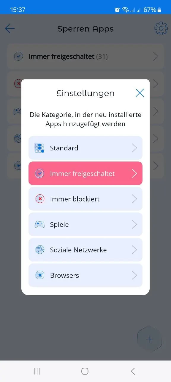 Zum Beispiel, wenn Eltern neue Apps blockieren möchten, müssen sie die Einstellung „Immer blockiert“ aktivieren. In diesem Fall wird die App blockiert, bis die Eltern sie in eine andere Kategorie verschieben.