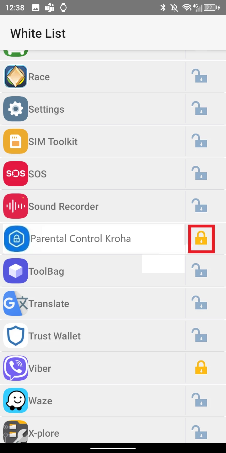 - Öffnen Sie das Menü der kürzlich gestarteten Apps > Tippen Sie auf das Symbol „Einstellungen“ (Schraubenschlüssel, Schraubendreher) > Tippen Sie auf das Schlosssymbol neben der App „Parental Control Kroha“ (nicht die App aus dem Speicher entladen).