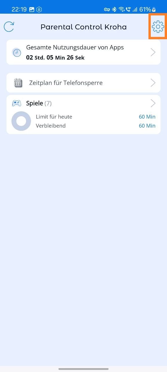 Öffnen Sie dann die App „Parental Control Kroha“ auf dem Gerät des Kindes > Tippen Sie auf das Zahnradsymbol > Tippen Sie auf die Schaltfläche „2 Minuten ausschalten“ > Geben Sie den PIN-Code ein. Dies ist notwendig, damit die Einstellungen auf dem Gerät des Kindes 2 Minuten lang nicht blockiert werden und Sie sie überprüfen können.
