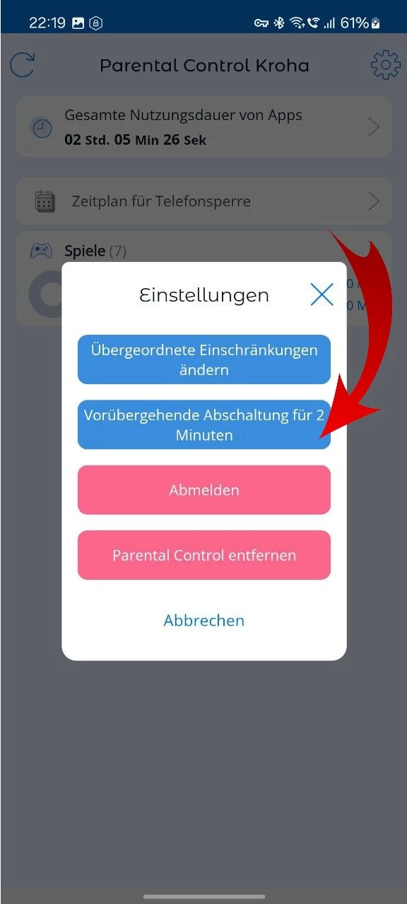 Öffnen Sie dann die App „Parental Control Kroha“ auf dem Gerät des Kindes > Tippen Sie auf das Zahnradsymbol > Tippen Sie auf die Schaltfläche „2 Minuten ausschalten“ > Geben Sie den PIN-Code ein. Dies ist notwendig, damit die Einstellungen auf dem Gerät des Kindes für 2 Minuten nicht blockiert werden und Sie diese überprüfen können.