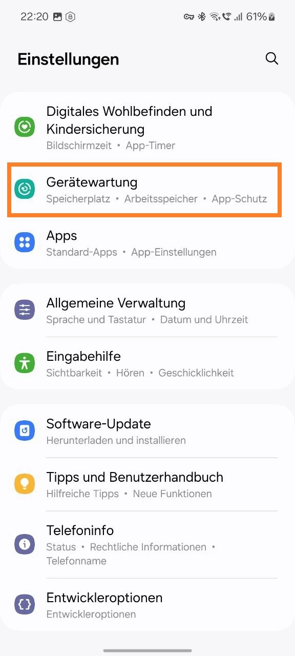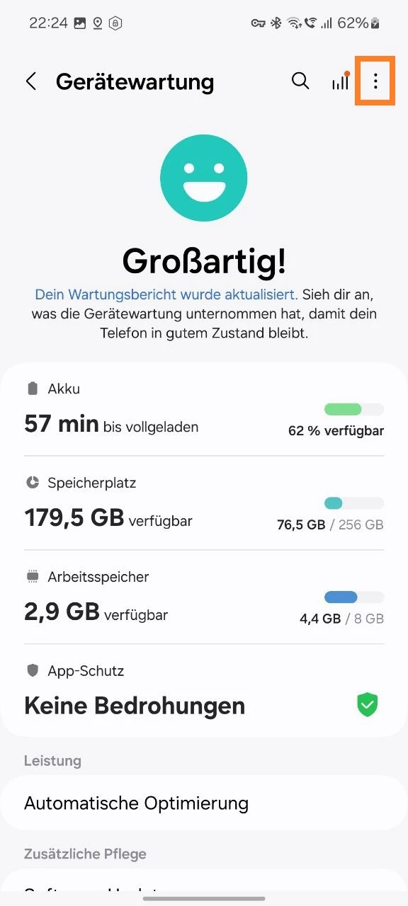 - Gehen Sie auch im Abschnitt „Gerätewartung“ zu „Batterie“ und öffnen Sie den Punkt „Strommodus“ > Wählen Sie die Option „Hohe Leistung“ und deaktivieren Sie den „Adaptiven Strommodus“ > Kehren Sie zurück und tippen Sie in der oberen rechten Ecke des Bildschirms auf das Menüsymbol (drei vertikale Punkte) > Öffnen Sie das Menü „Einstellungen“ > Deaktivieren Sie alle Schalter.