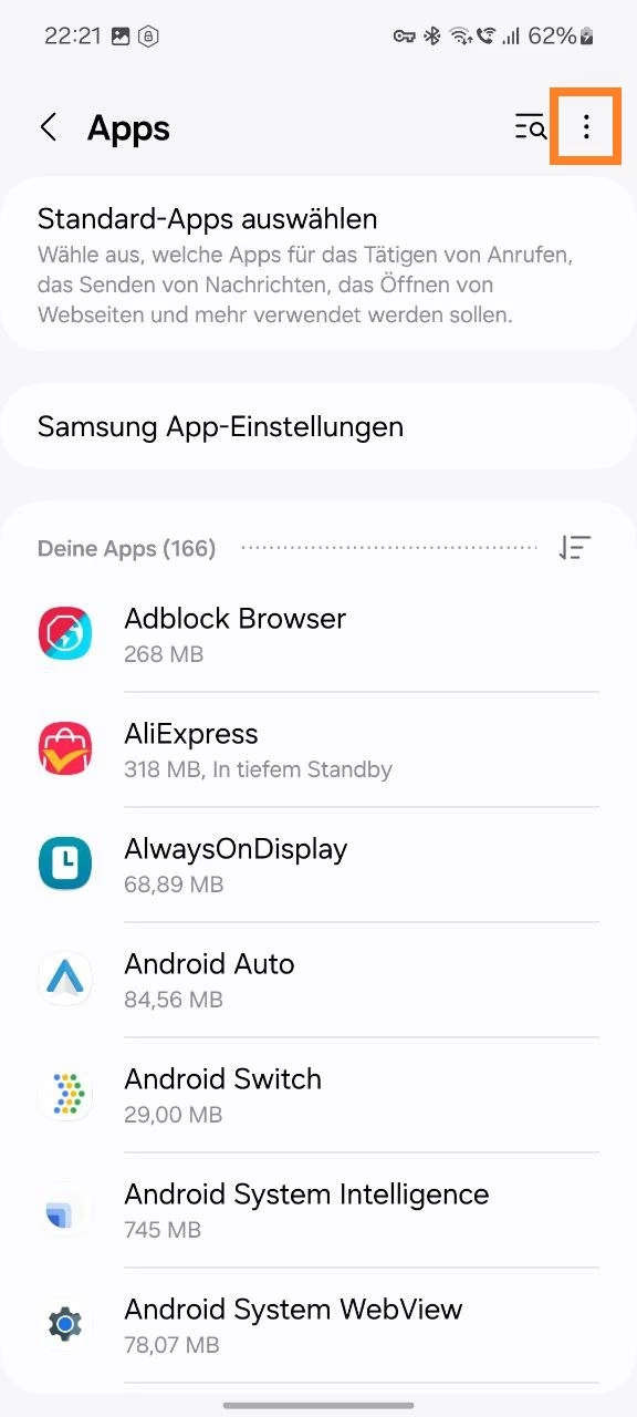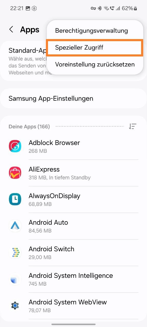 - Öffnen Sie die „Einstellungen“-App auf dem Gerät des Kindes > Öffnen Sie den Abschnitt „Apps“ > Tippen Sie in der oberen rechten Ecke des Bildschirms auf das Menüsymbol (drei vertikale Punkte) > Wählen Sie den Punkt „Besondere Berechtigungen“ > Gehen Sie zu „Batterieverbrauchsoptimierung“ > Suchen Sie die App „Parental Control Kroha“ in der Liste und deaktivieren Sie den Schalter (nicht optimieren);