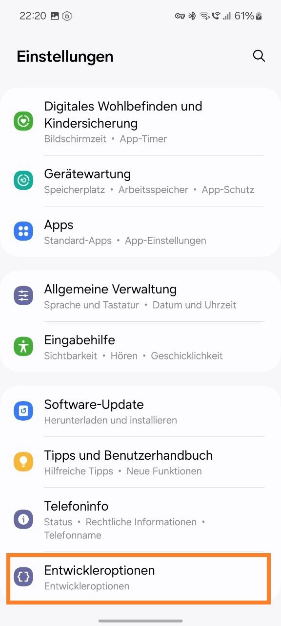 - Unten erscheint der Abschnitt „Entwickleroptionen“, tippen Sie darauf.