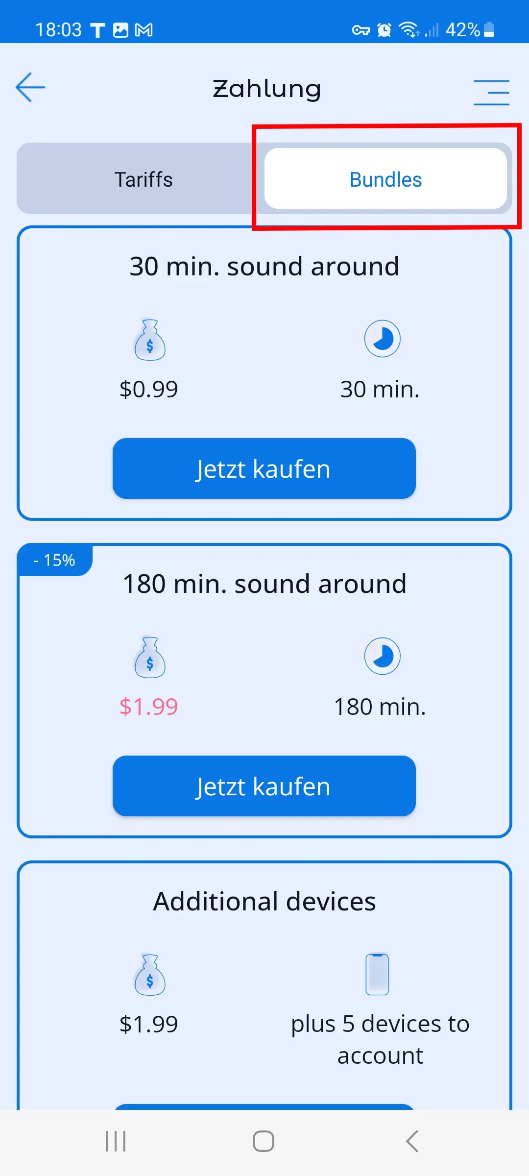 Sie können Ihr Konto mit zusätzlichen Geräten erweitern, zusätzliche Minutenpakete für die Funktion „Umgebungsgeräusche des Kindes anhören“ erwerben oder zusätzliche Pakete für die Funktion „Screenshots“ kaufen.