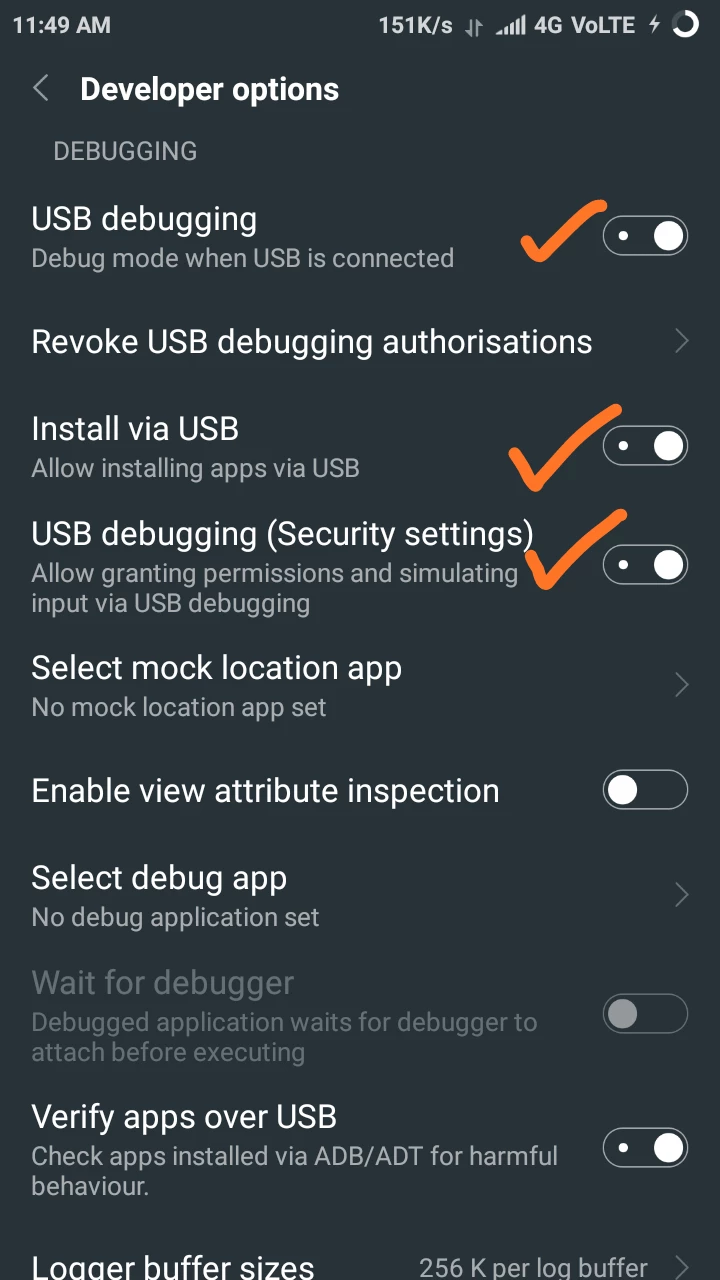 Note that on some devices, in addition to the “Debug by USB” switch, there are “Setup by USB” and “Debug by USB (security settings)” switches in the developer options. If you find these switches on your child's device, turn them on.