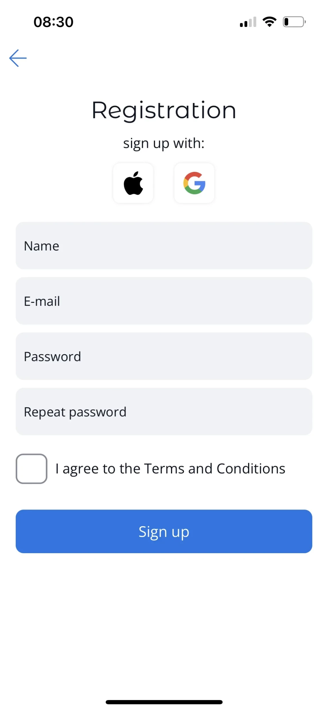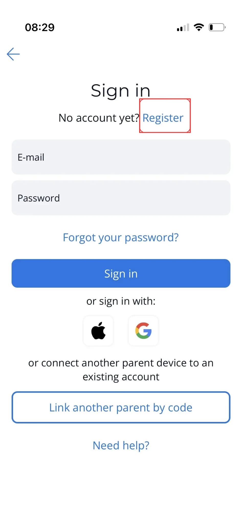 3. On the “Register” screen, you can register with an Apple account, Google account, or enter your name, email address, and create a password.