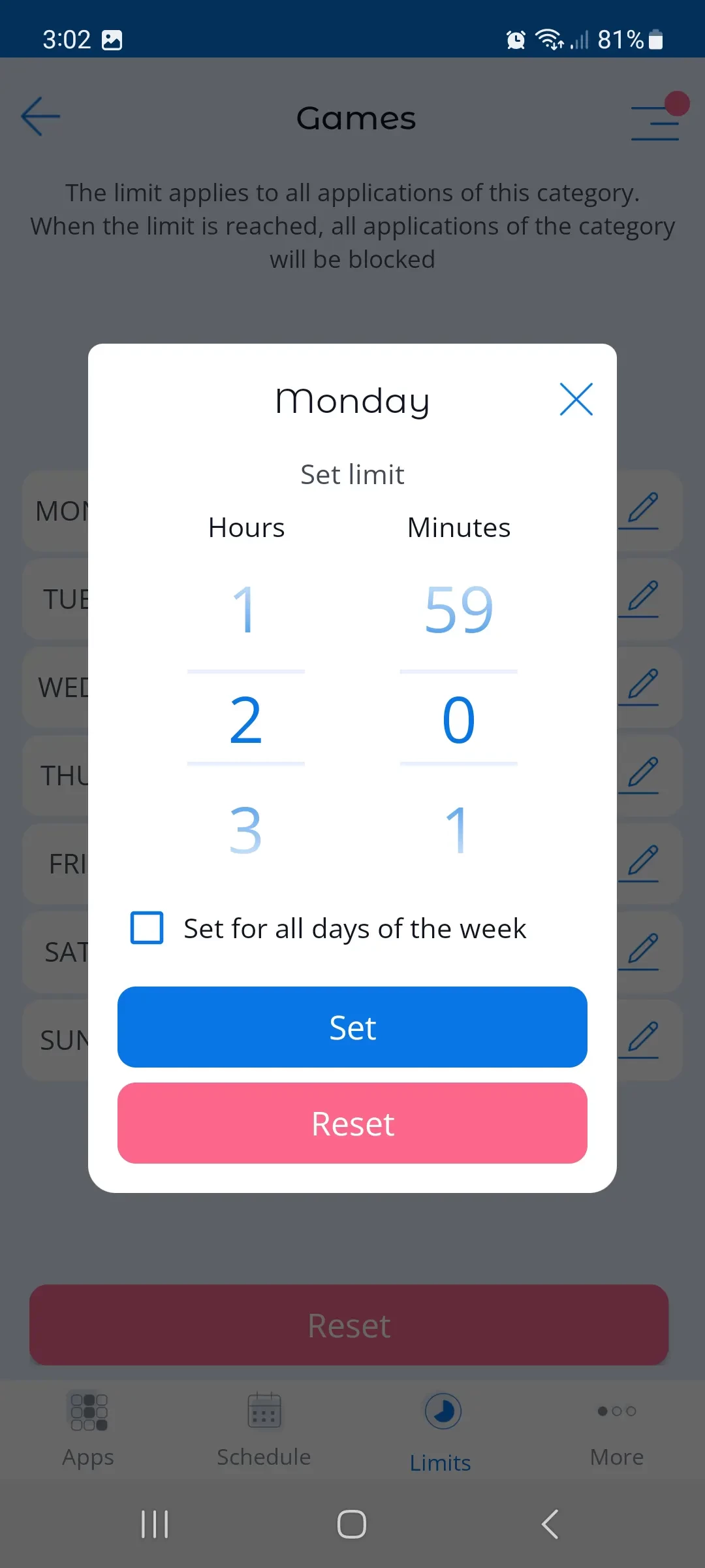 To set a limit, select the day of the week and set the time to which you want to limit app usage per day. You can set this limit for all days of the week at once by setting the appropriate parameter.