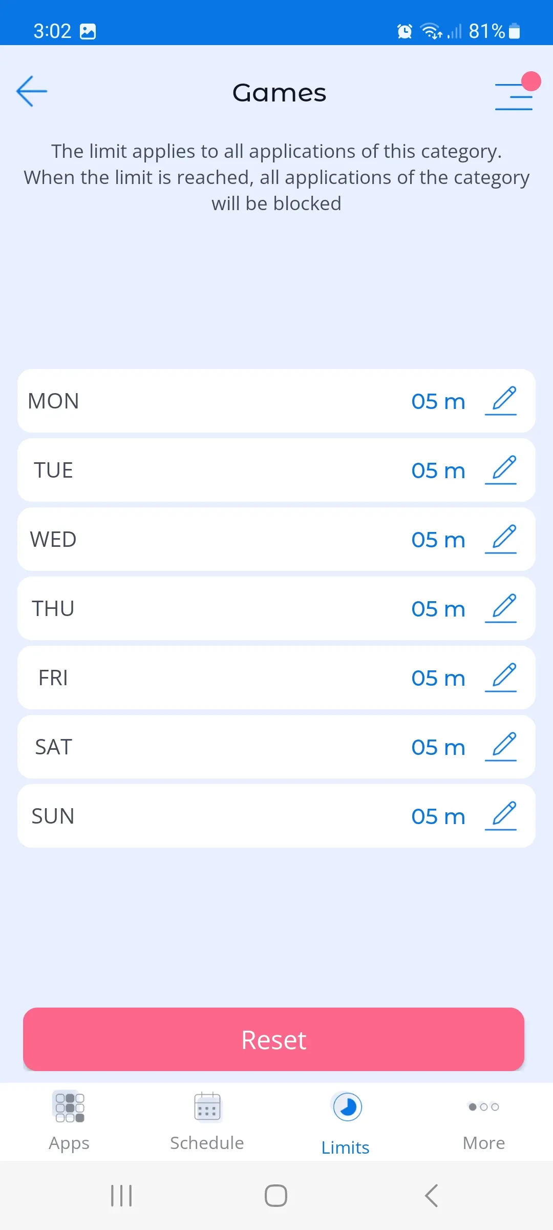 The child will be able to use apps of the selected category within the limit. When the limit is reached, the apps will be blocked.
