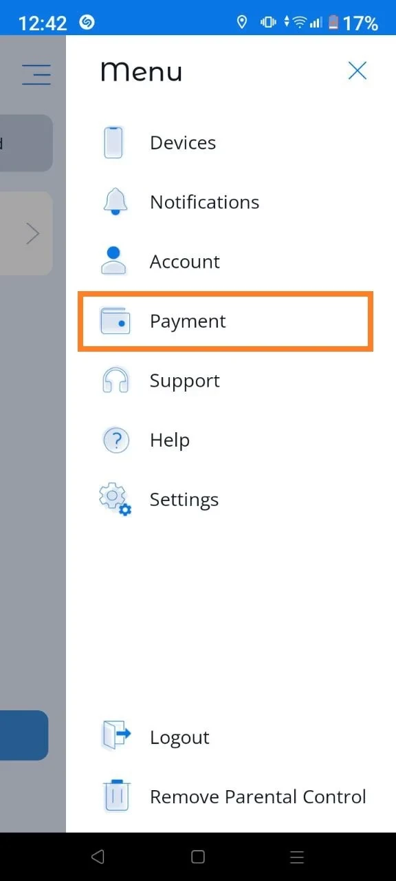 - Click on the menu icon in the upper right corner and go to the Payment menu;