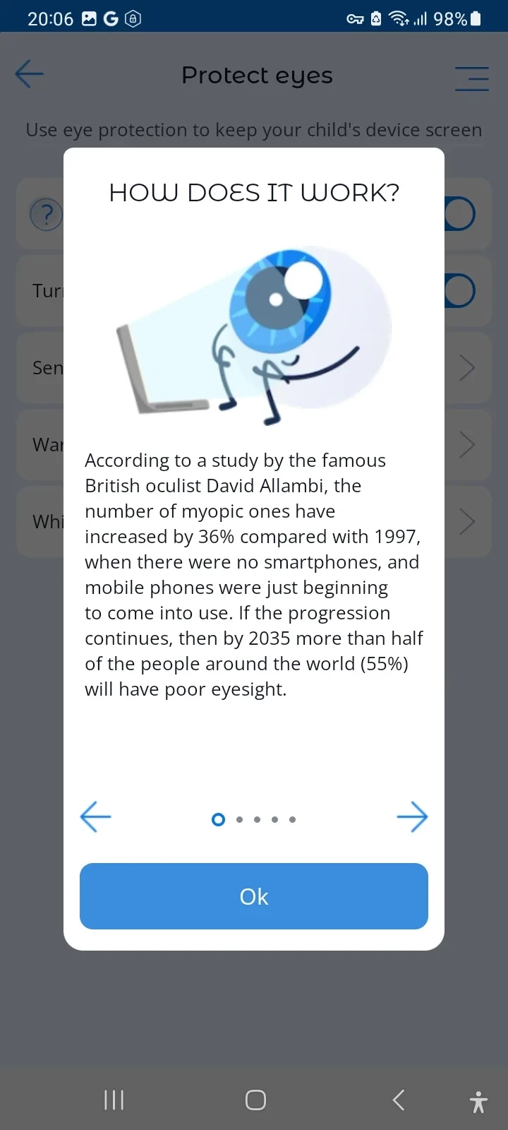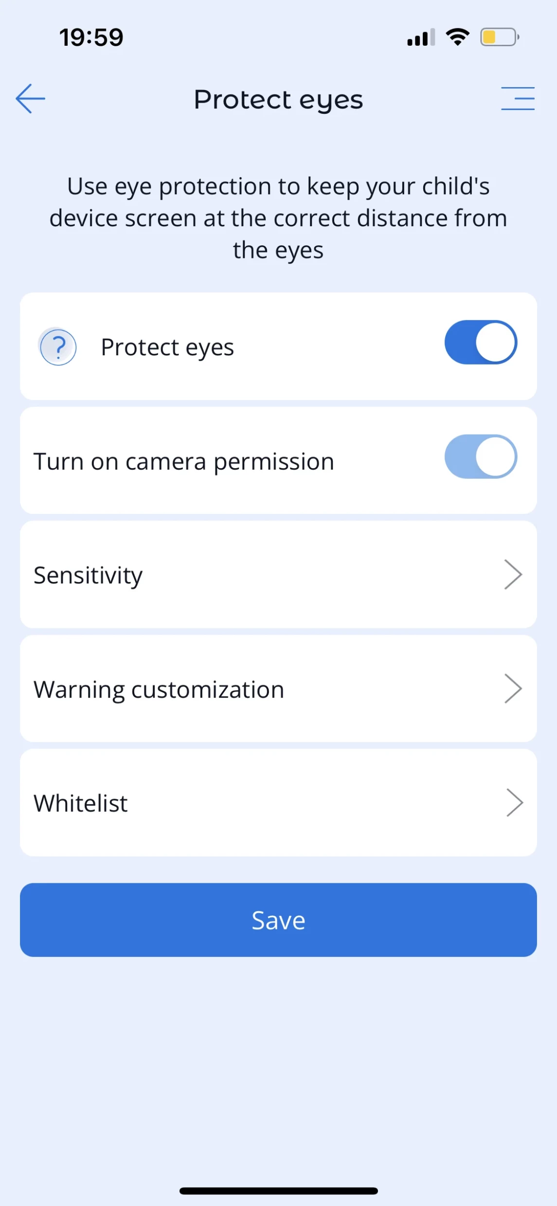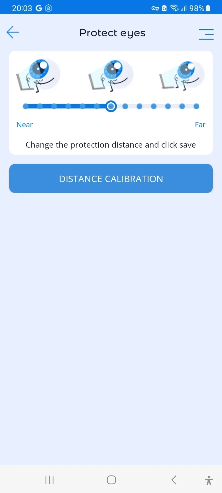 The default safe distance from the screen to the eyes is set based on the recommendations of ophthalmologists (30 cm). The parents can adjust this distance with the slider at the bottom of the Eye Protection screen.