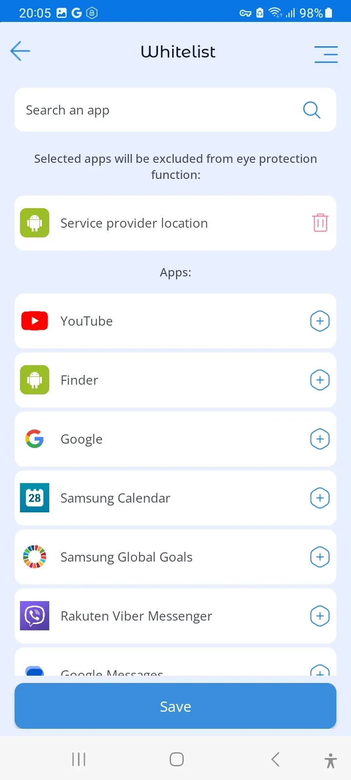 Whitelist: If you don't want Eye Protection to block certain apps, you can add them to a whitelist and the screen won't lock when those apps are launched.