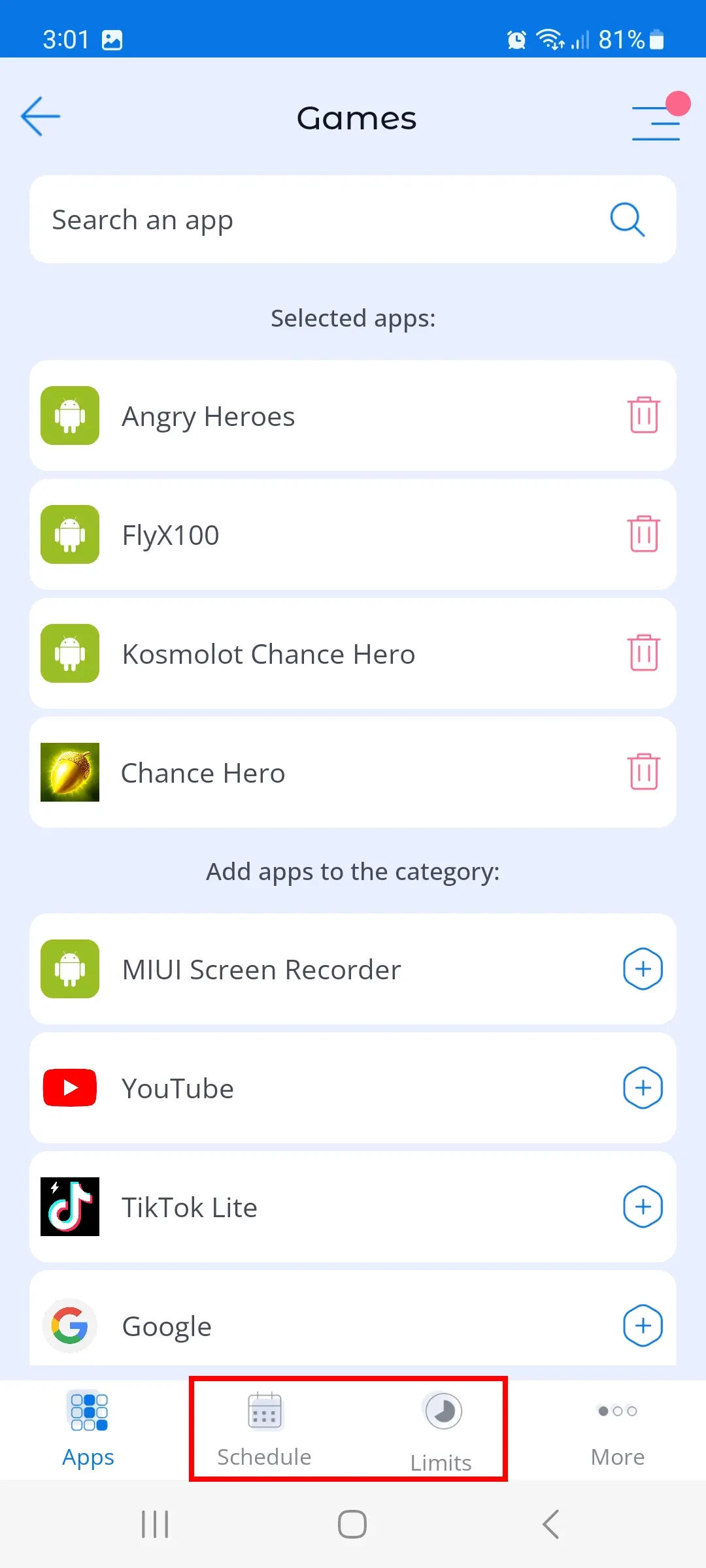 In order for parents to limit the time their child spends on games or other apps, they need to set limits on a certain category of apps.