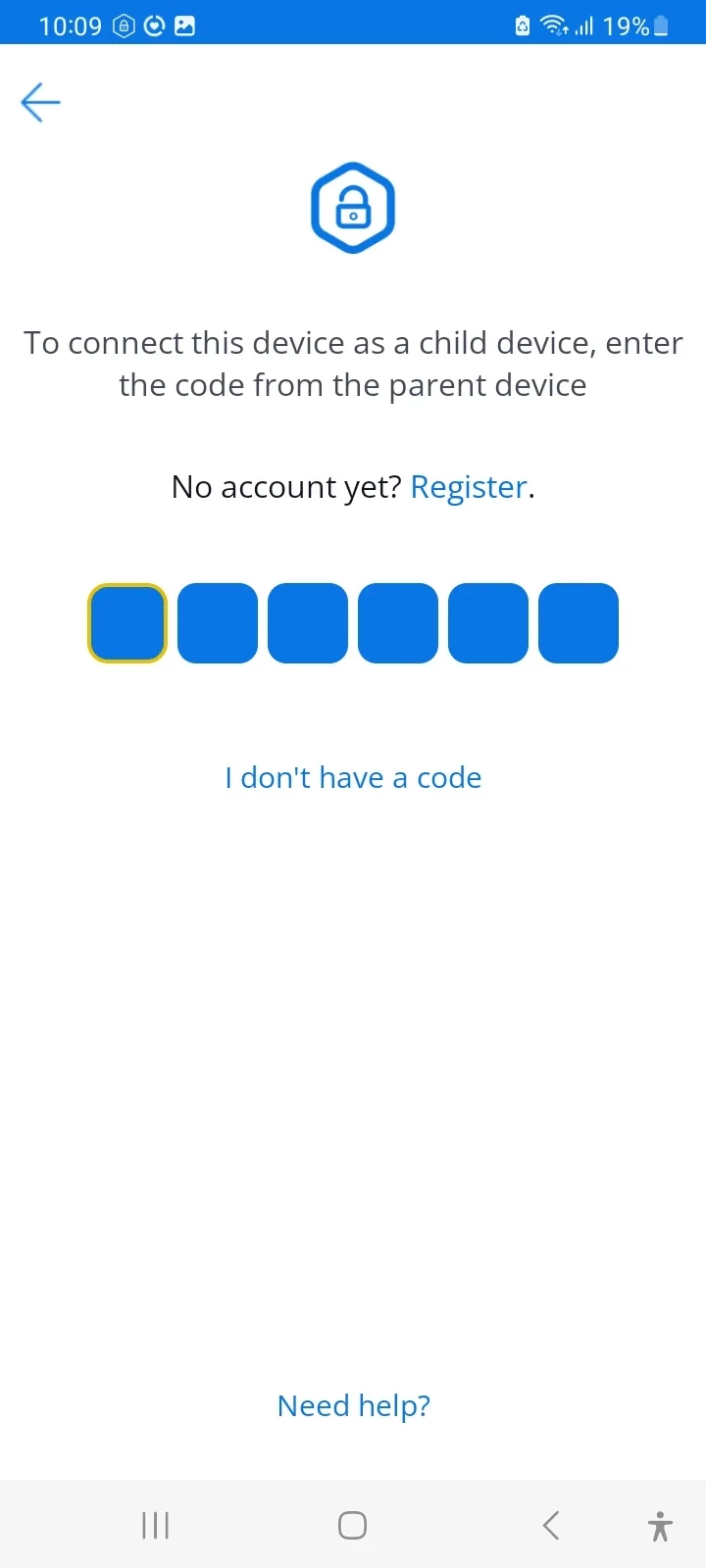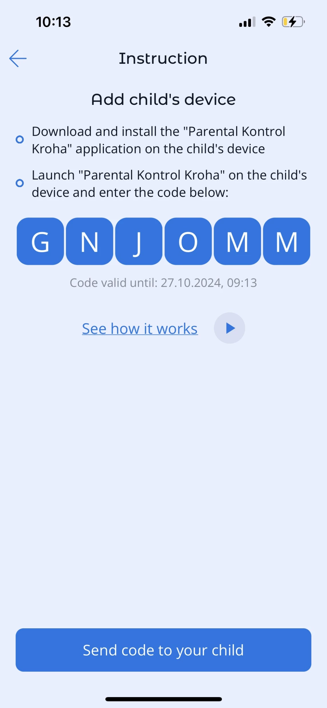 3. Open the Parental Control Kroha app on your child's device and enter the code.