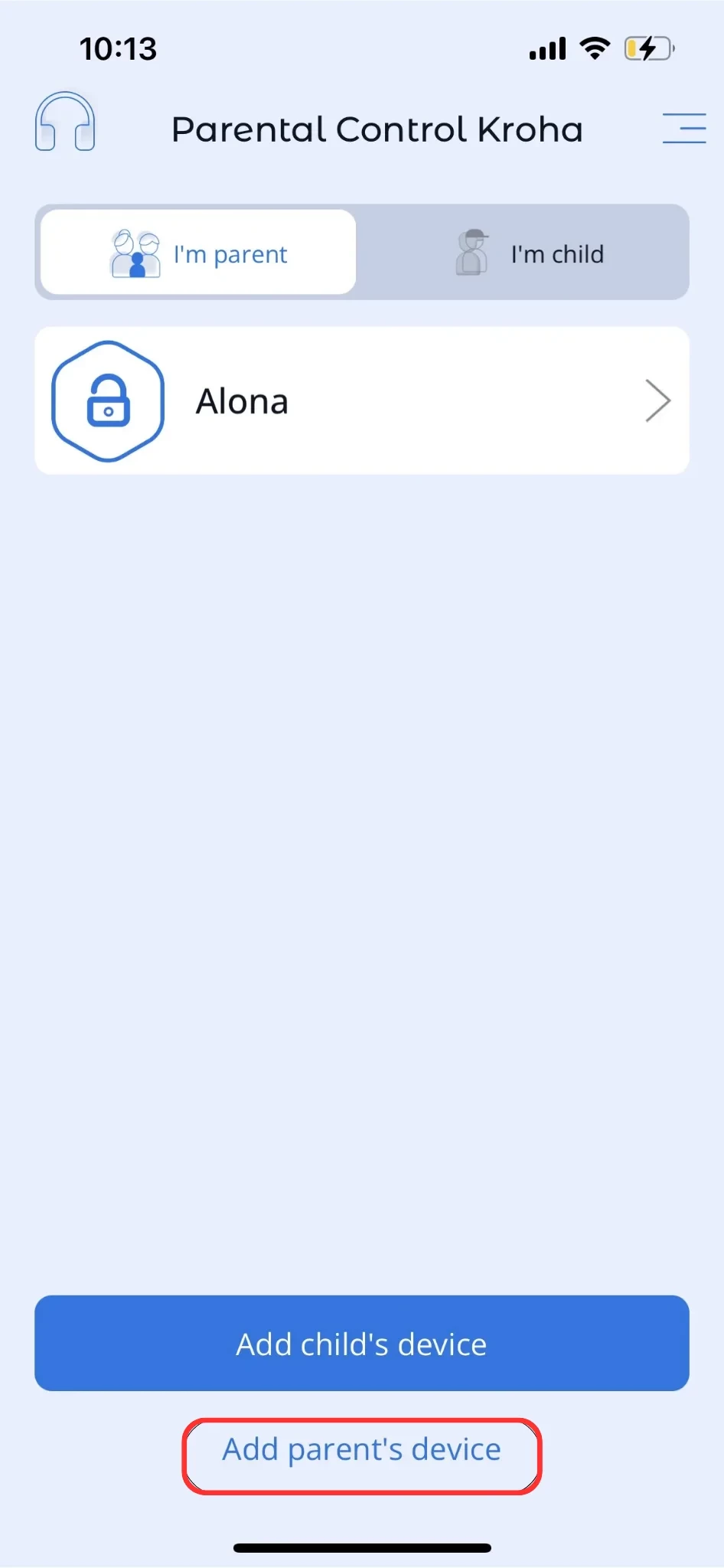 1. Open the Parental Control Kroha app on the first parent's device;