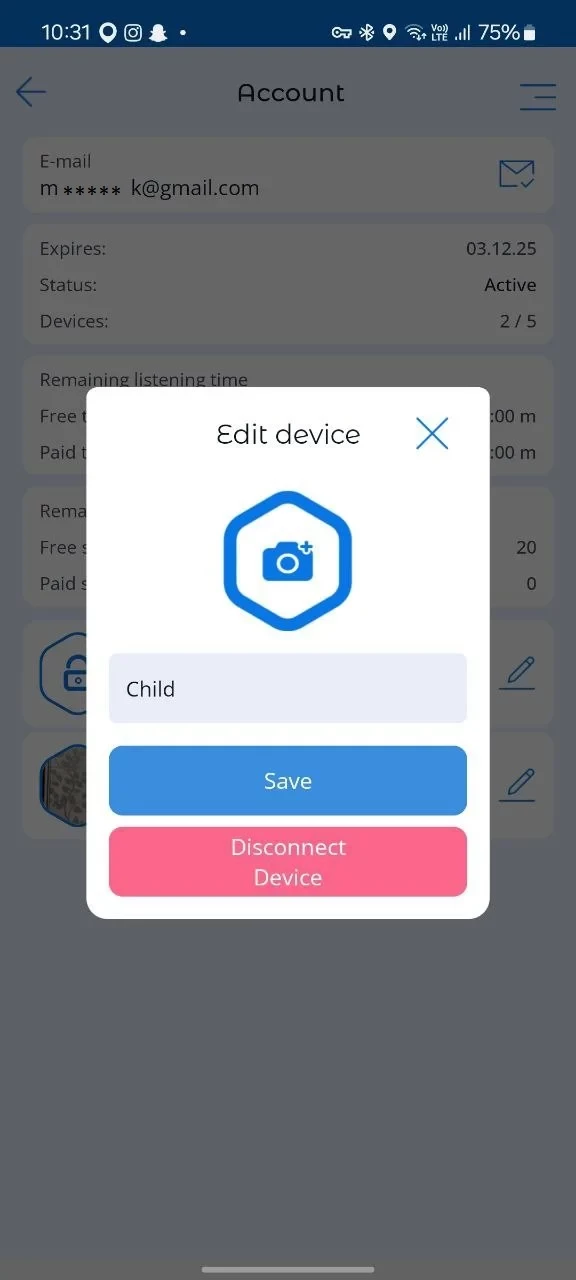 5. Select the “Disconnect” action to remove the device from the account or create a new name and click “Save” to rename the device