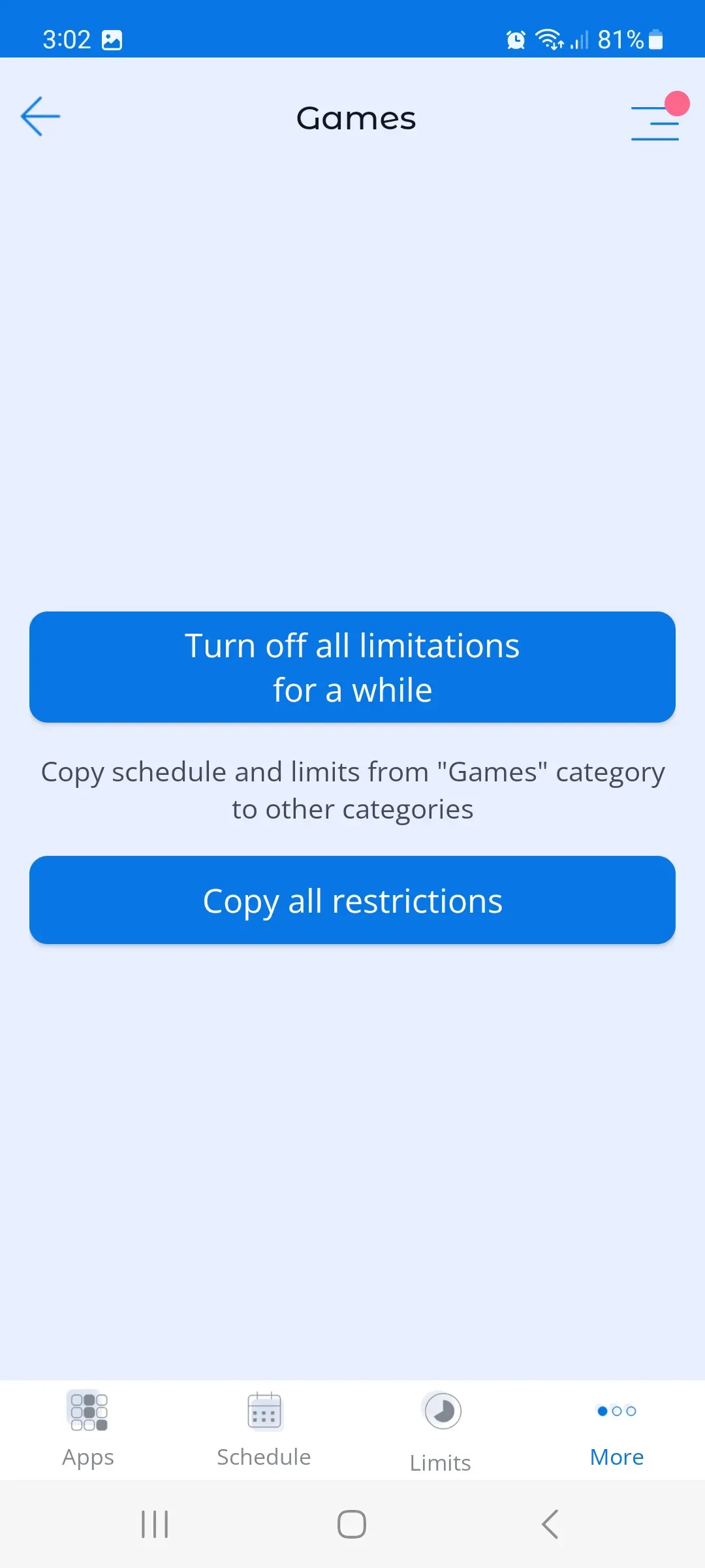 If the limit has run out and the parents want to add some playtime for the child, pressing the “Disable all time limits” option in the additional menu “More” you can disable the locks for any period. For easy customisation, in the same menu, you can duplicate the set limits to other categories as well.