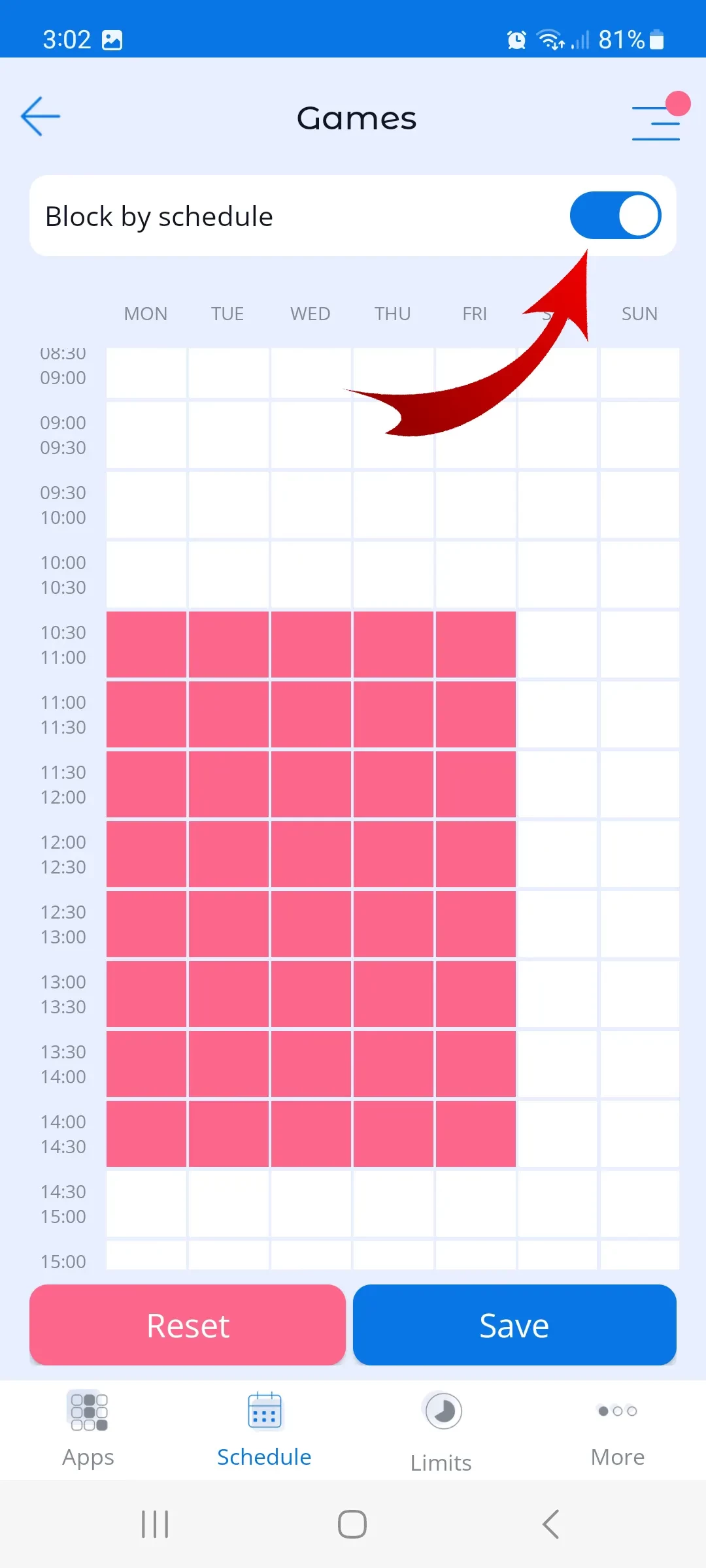 To set a schedule in the App Lock feature, the parents set up app locks for a period of time when the child should not be distracted by playing games, watching videos or communicating on social media (e.g. at school). Lock the desired time period by clamping the cell at the beginning of the period and dragging the cell selection to the end of the locking period. Activate the “Scheduled Lock” toggle. The time corresponding to the selected cells will be blocked for applications of the selected category.