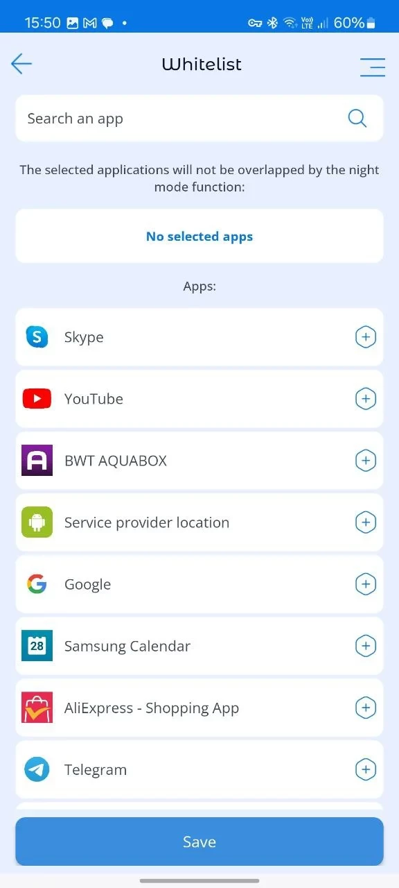 White list: If you do not want the Night Mode feature to work for certain apps, you can add them to a whitelist and the Night Mode feature will be disabled when those apps are launched.