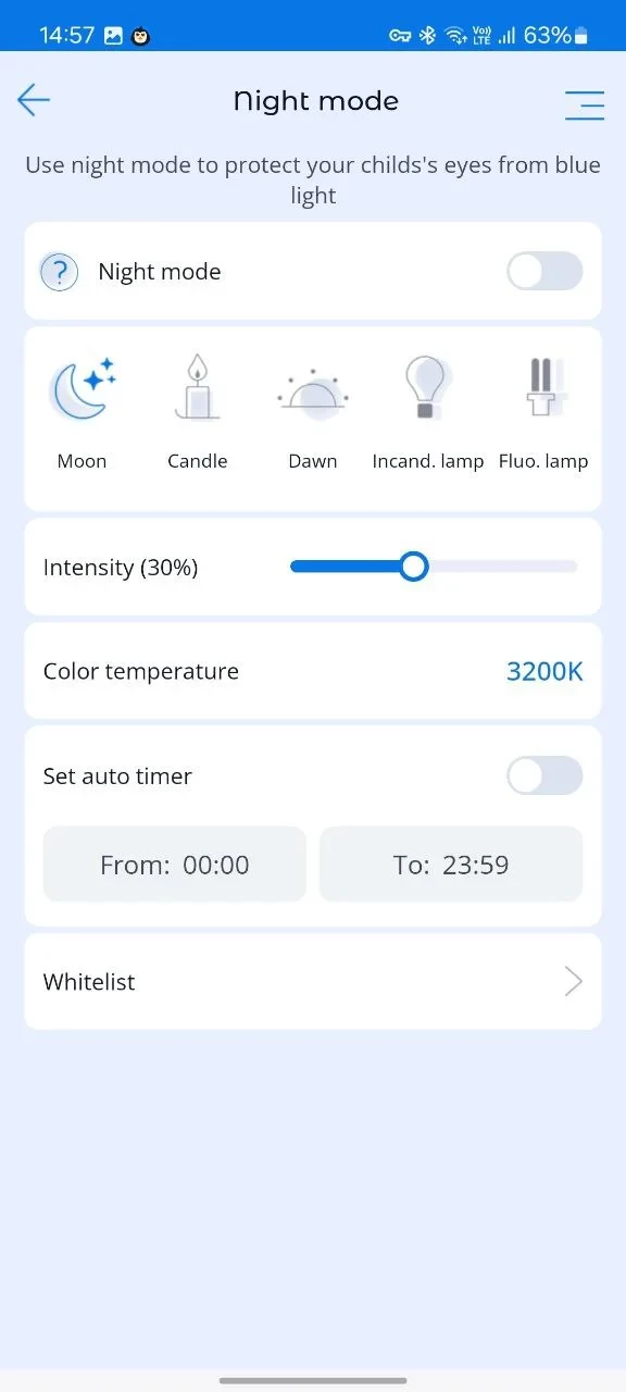 1. Use an auto timer that automatically turns on night mode. A schedule should be set beforehand, according to which the function will be switched on in the evening and off in the morning, at a time set by the parents.