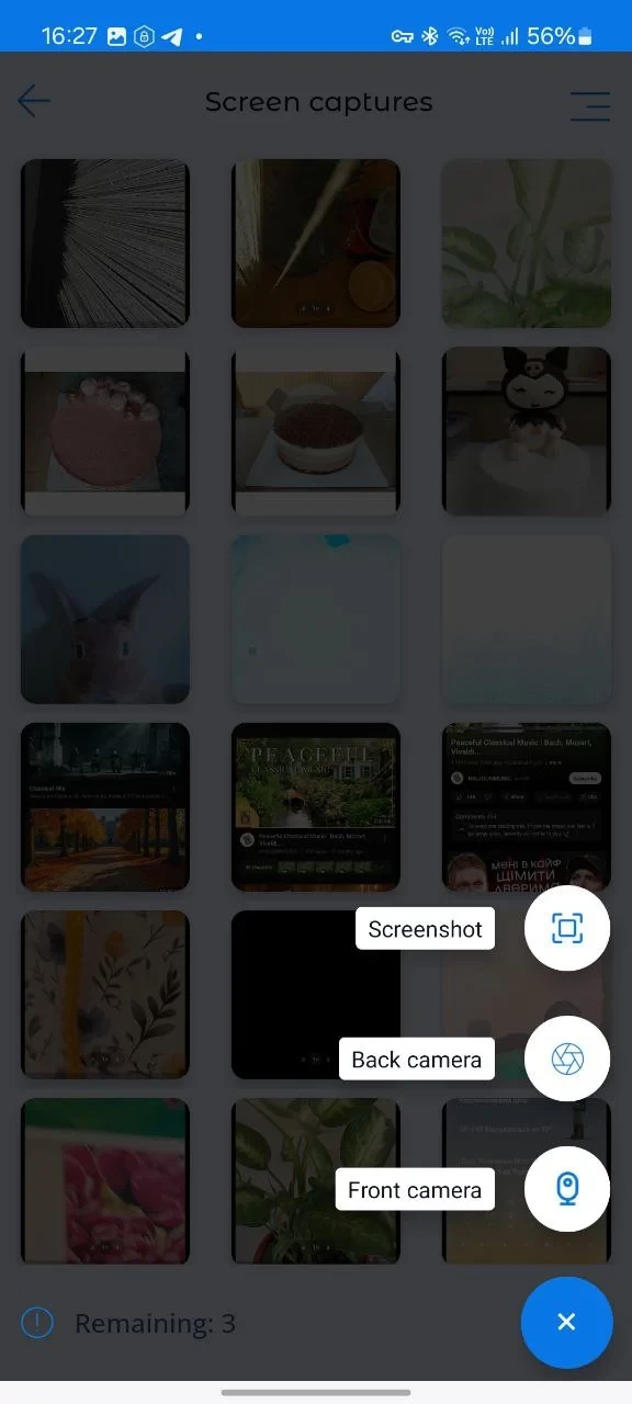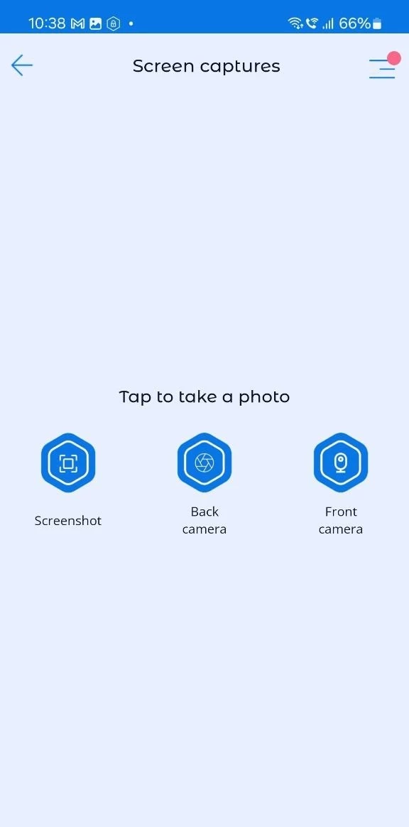 To take a photo, go to the "Screen captures" section, select the type of photo you want to receive. A request to receive a photo will be sent to the child's device (the child doesn’t see the request).