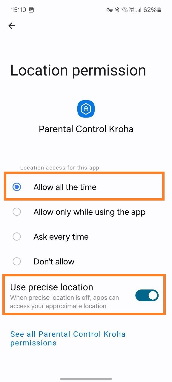 4. Open the Settings app on the child's device > Location > App permissions > Parental Control Kroha > select "Allow all the time" and enable the "Use precise location" switch.