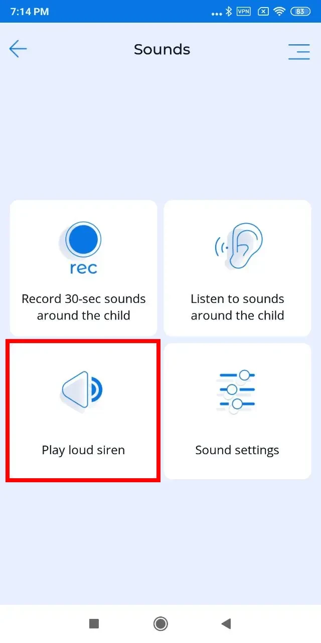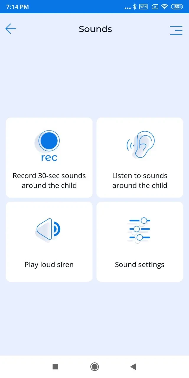 In the "Sounds" section, parents have the opportunity to: record 30-second sounds, listen to the sound around the child's device, turn on a loud siren, turn on the sound on the child's device.
