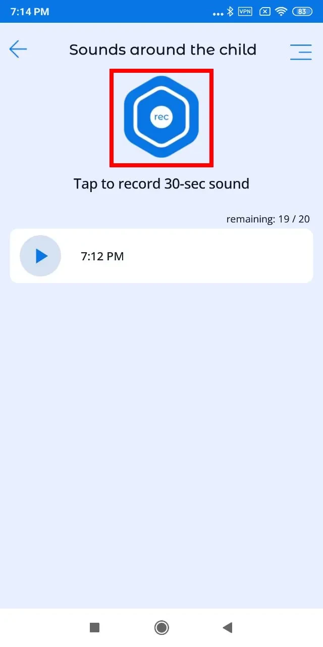 To record audio, go to the appropriate section and press the button to record audio. The audio recording request will be sent to the child's device (the child does not see this request). Once the sound is recorded, it will appear in the list of recordings and the parent can listen to it.