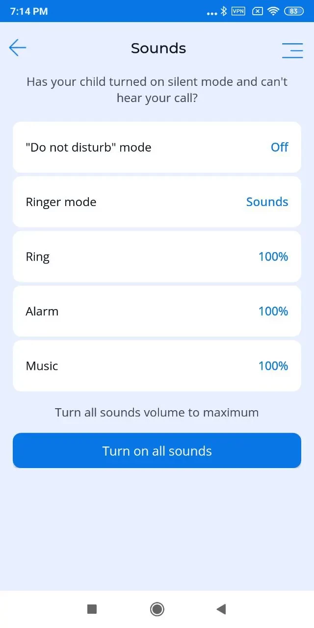 Here you can remotely disable “Silent Mode” on your child's smartphone if your child has turned it on, for example at school, and forgets to turn it off. The parents will be able to turn on sounds on the child's smartphone so that the child hears the call.
