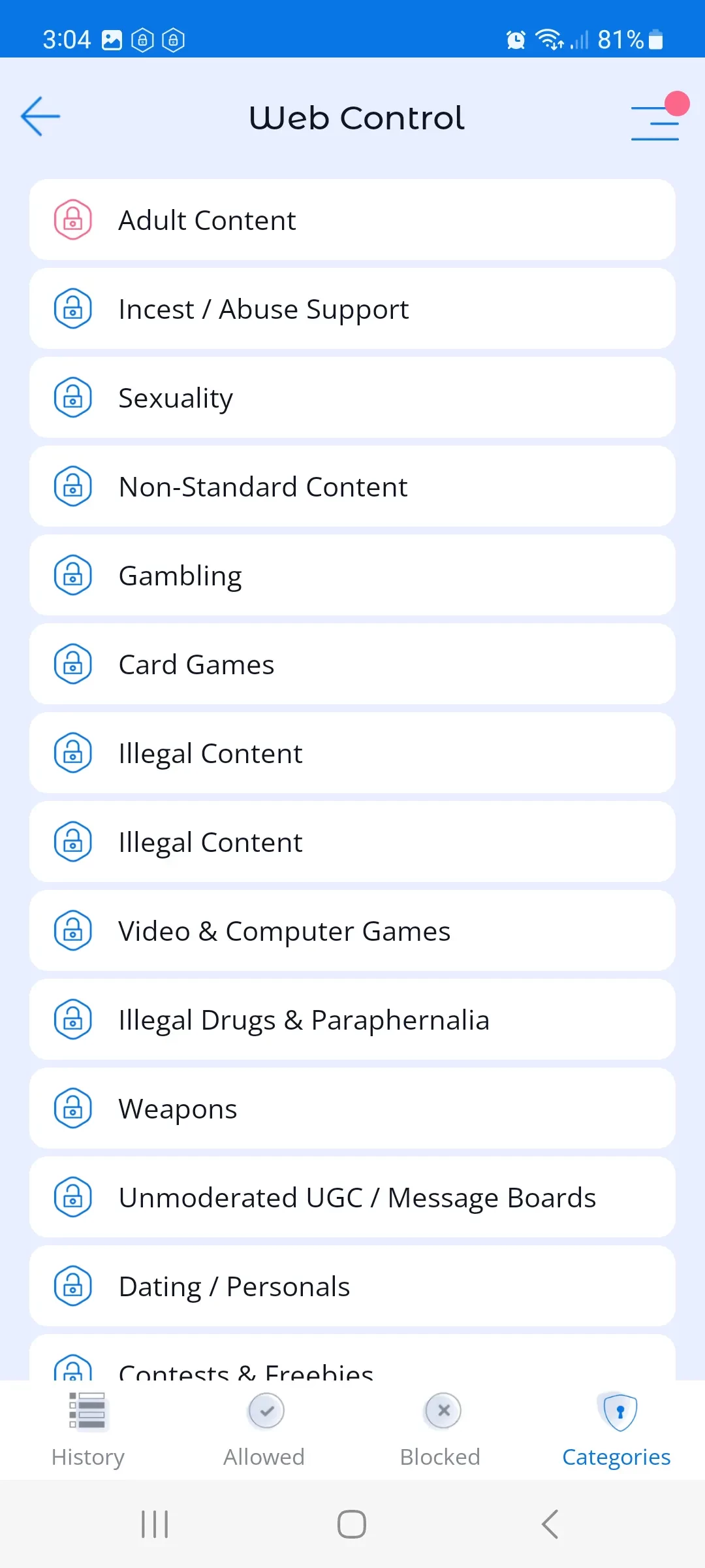 - Blocking unwanted categories of websites, for example, “adult content”;
