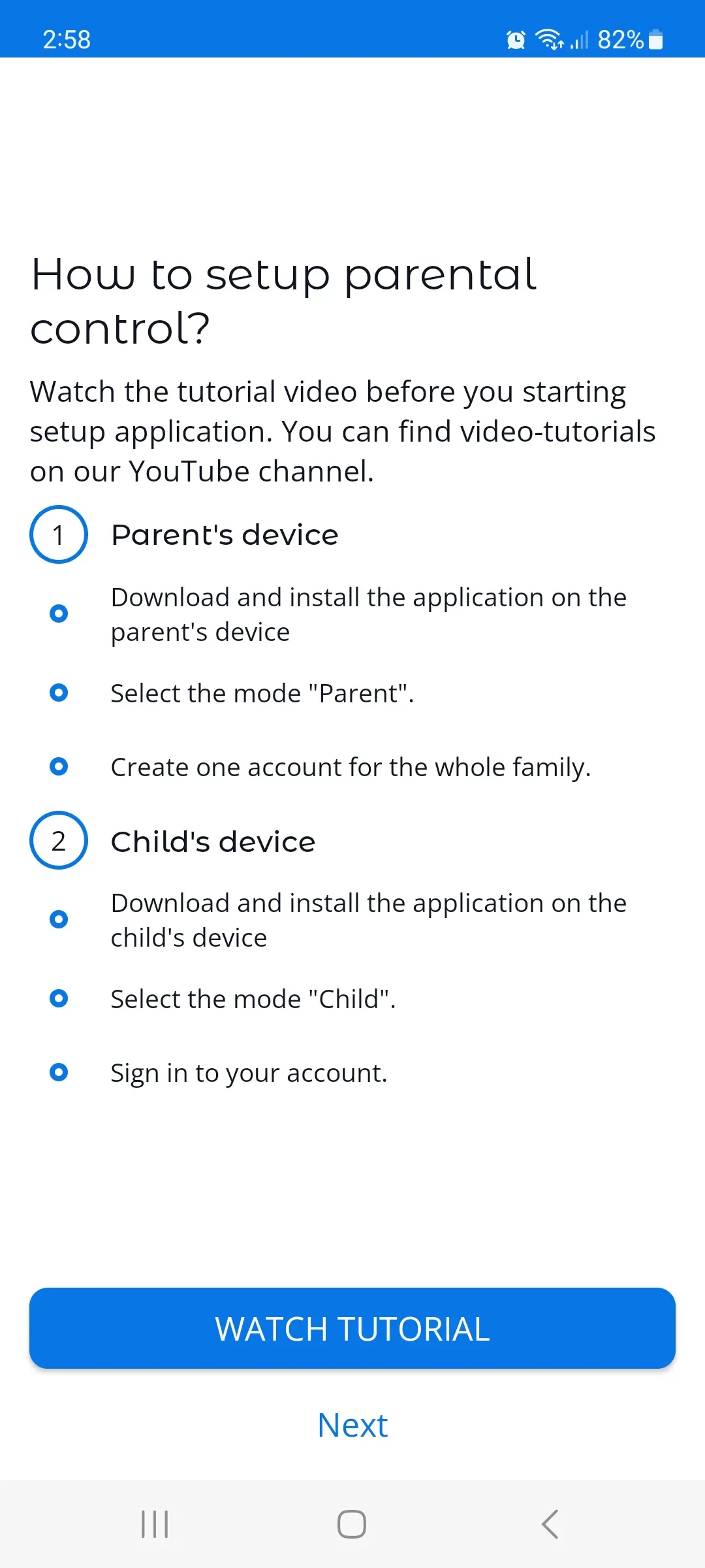 3. The button that leads to the instructions to connect the Child's or other Parent's new devices. On this screen, the parent can also find a video instruction.