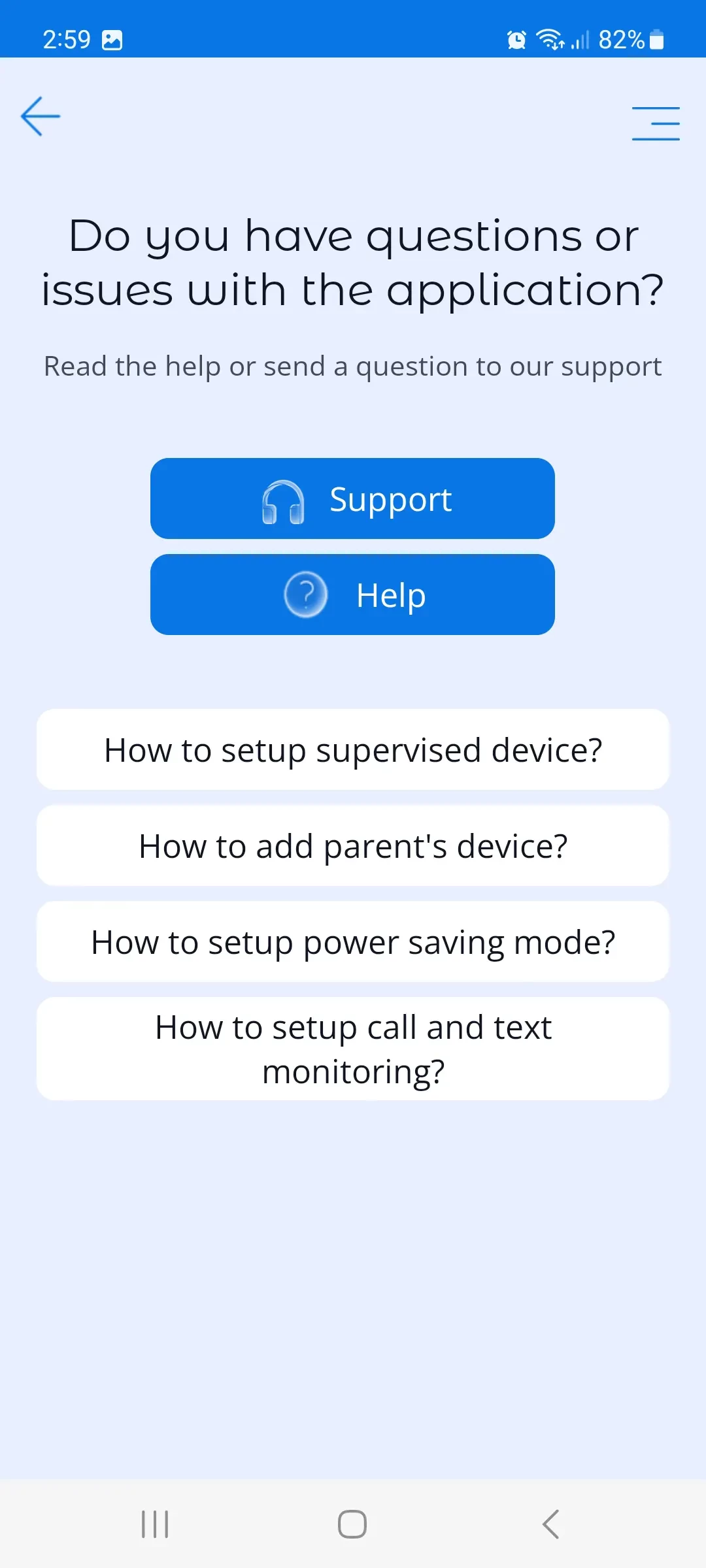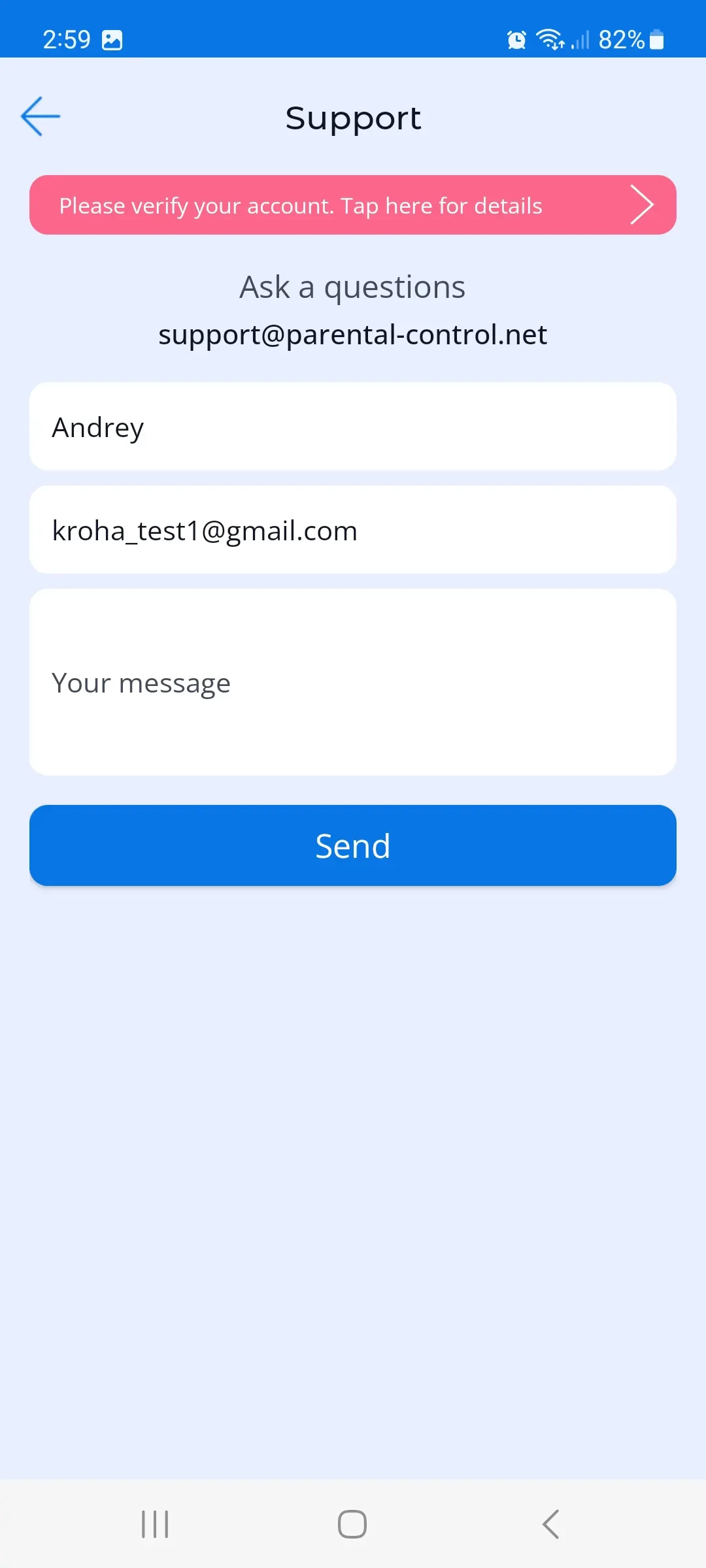 4. In the bottom right menu, there is a button to contact support. In this menu, you can get quick help on issues related to the use of the app. The answer will be sent to the e-mail address you specified when registering.